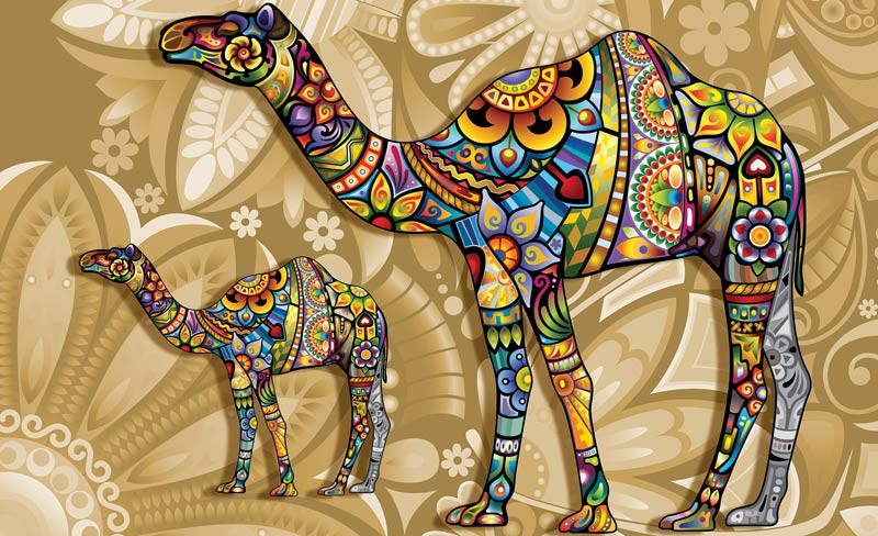Fototapete von einem schönen Kunstwerk mit einem verzierten Dromedar und einige Blumen.