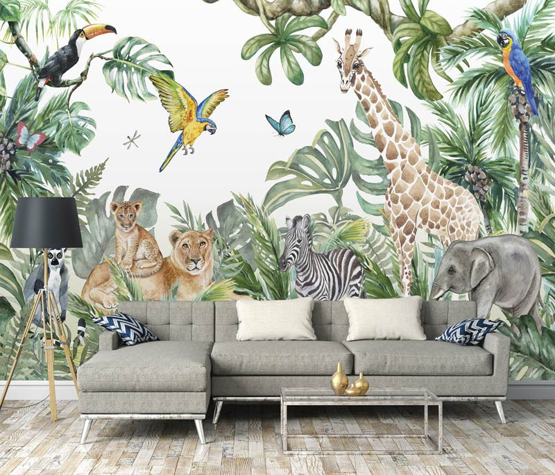 Die satten und leuchtenden Farben der Tiere und des Dschungels kommen gestochen scharf zur Geltung und tragen zu einem atemberaubend realistischen Effekt bei. Die präzisen Details im Fell der Tiere, in den Federn der Vögel und in den Blättern des Dschungels verleihen dieser Fototapete ein lebensechtes Gefühl. Sie schafft eine fröhliche und inspirierende Umgebung, in der Kinder spielen und träumen können.