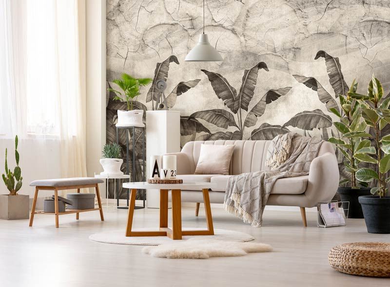 Bringen Sie die Natur in Ihr Zuhause mit unserer Fototapete Dschungelpflanzen und Blätter auf einer Betonwand. Ob Sie ein modernes Interieur oder eine eher traditionelle Einrichtung haben, unsere Fototapete Dschungelpflanzen und Blätter passt perfekt zu jedem Stil.