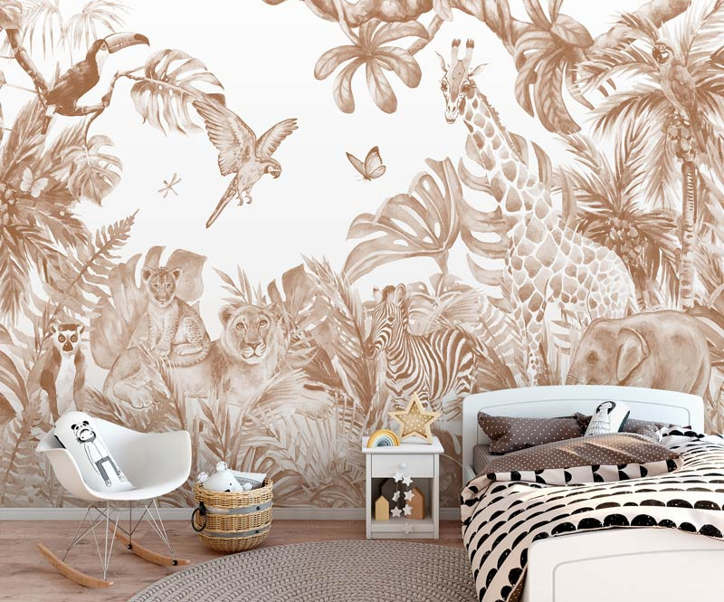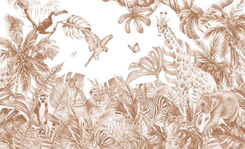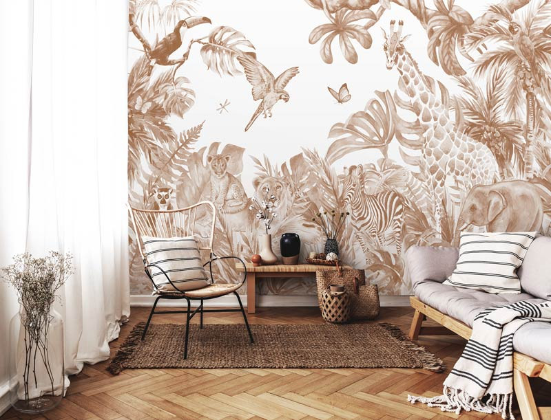 Die Dschungel-Fototapete in Terrakotta-Farben ist ein echter Blickfang und die perfekte Ergänzung für jeden Raum.