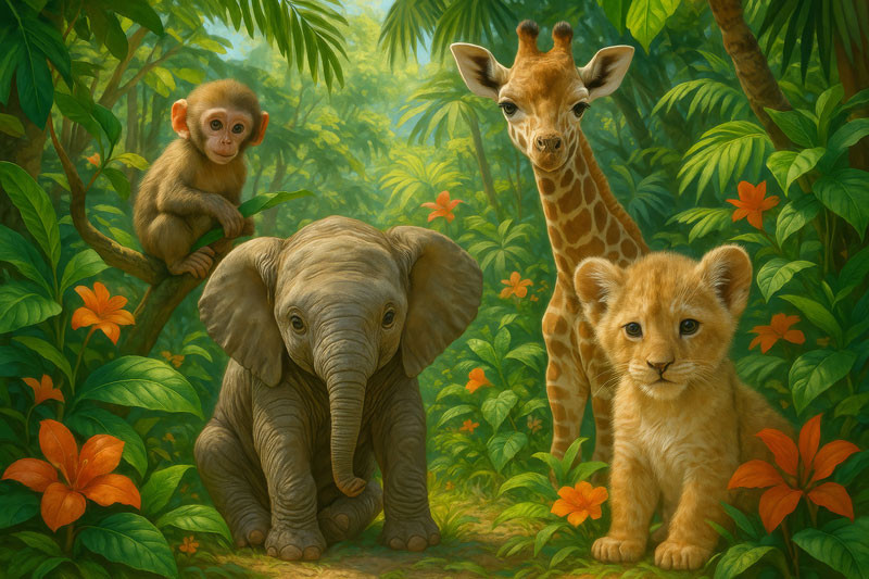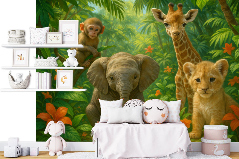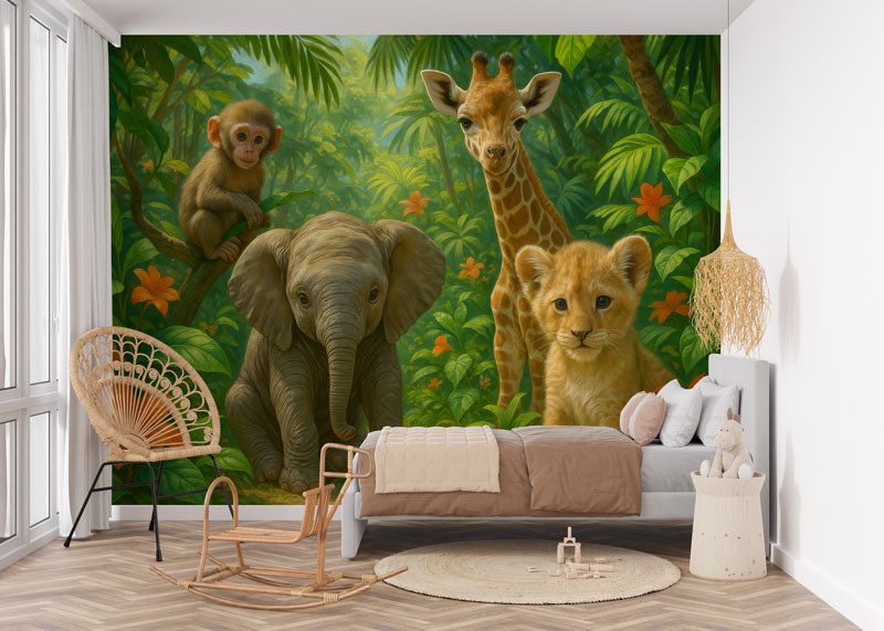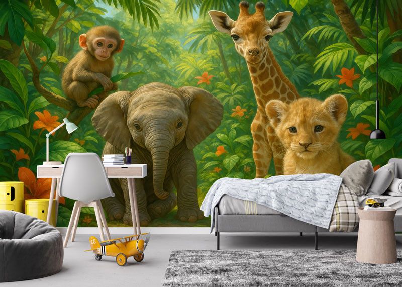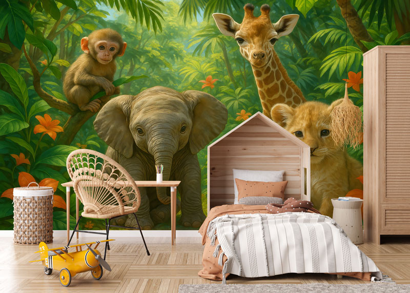 Mit der Fototapete Jungle Animal Friends holen Sie sich ein Design in Ihr Zuhause, das Natur, Farbe und Fröhlichkeit vereint. Bestellen Sie die passgenaue Fototapete und erfreuen Sie sich an einer bezaubernden Wand, die Kinder jeden Tag zum Strahlen bringt.