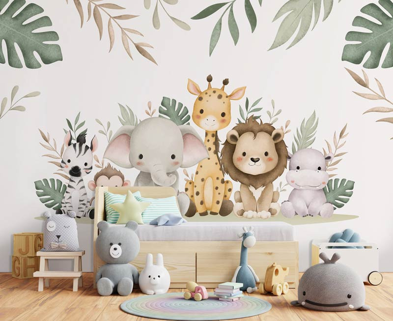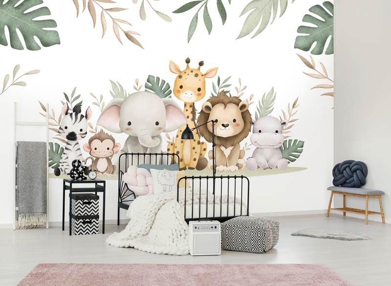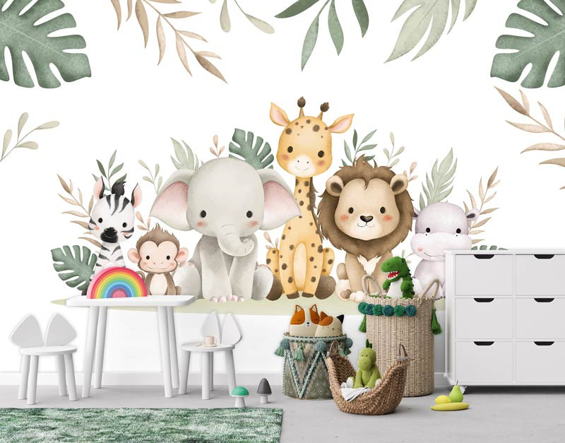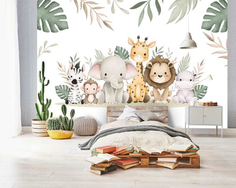 Bringen Sie mit unserer Fototapete Dschungeltiere Wunderland eine abenteuerliche und fröhliche Atmosphäre in das Zimmer oder Kinderzimmer Ihres Babys. Diese lebendige Fototapete zeigt eine charmante Sammlung von Dschungeltieren wie Elefant, Löwe, Affe, Giraffe, Nilpferd und Zebra, umgeben von üppigen Dschungelblättern. Perfekt, um eine spielerische und fantasievolle Umgebung zu schaffen, in der Kinder in ihr eigenes Dschungelabenteuer eintauchen können.