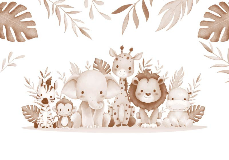 Verwandeln Sie das Baby- oder Kinderzimmer in einen warmen und abenteuerlichen Ort mit unserer Fototapete Dschungeltiere Wunderland Terracotta. Diese schöne Fototapete zeigt eine Sammlung von Dschungeltieren wie Elefant, Löwe, Affe, Giraffe, Nilpferd und Zebra, umgeben von Blättern in Terrakotta-Tönen. Ideal, um eine ruhige und fantasievolle Umgebung zu schaffen, in der Kinder ihre eigenen Dschungelabenteuer erleben können.