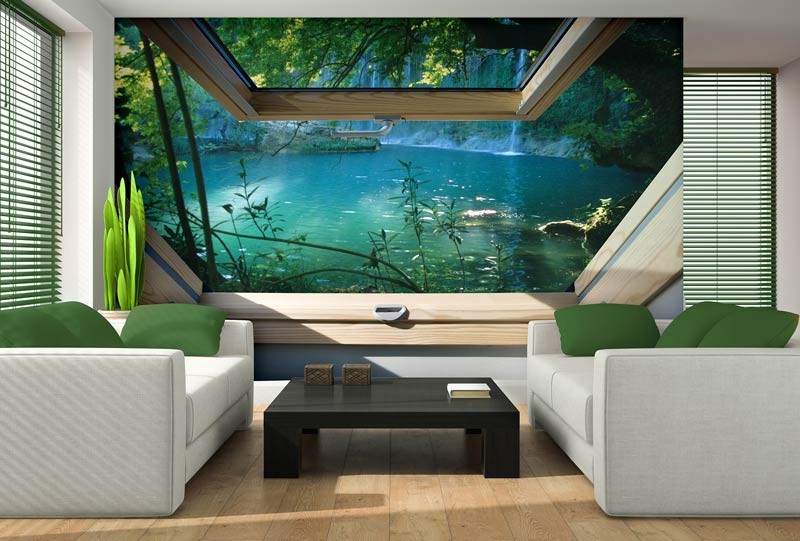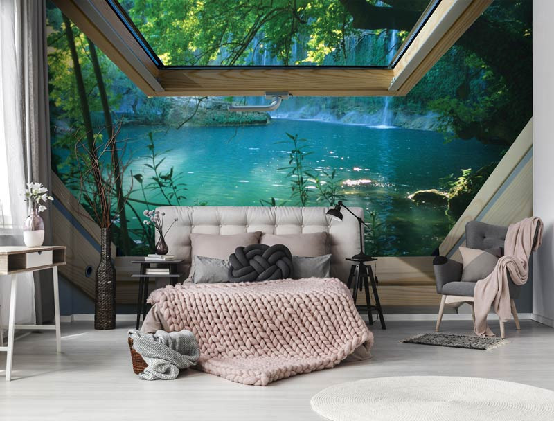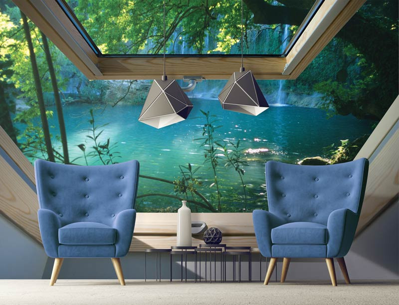 Vlies-Fototapete mit dem Blick aus dem Dachfenster auf einen hellblauen See im Dschungel, gerendert in 3D.