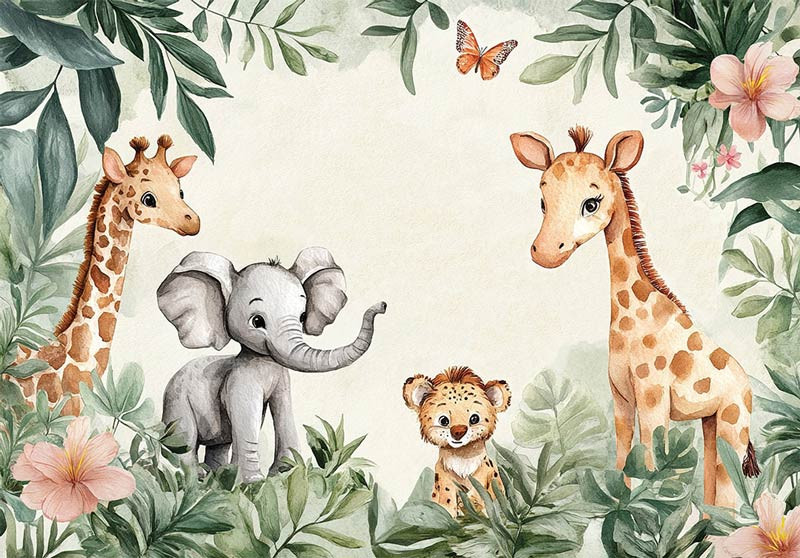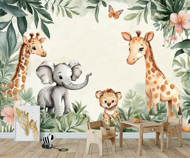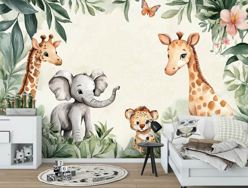Bringen Sie eine abenteuerliche Safari-Atmosphäre ins Kinderzimmer mit der bezaubernden Fototapete Dschungeltiere. Dieses stimmungsvolle Design, das sowohl für Jungen als auch für Mädchen geeignet ist, zeigt einen niedlichen Elefanten, zwei neugierige Giraffen und ein fröhliches Jungtier inmitten üppiger Dschungelpflanzen, tropischer Blumen und eines farbenfrohen Schmetterlings.