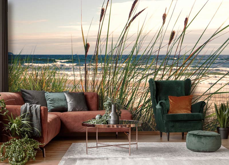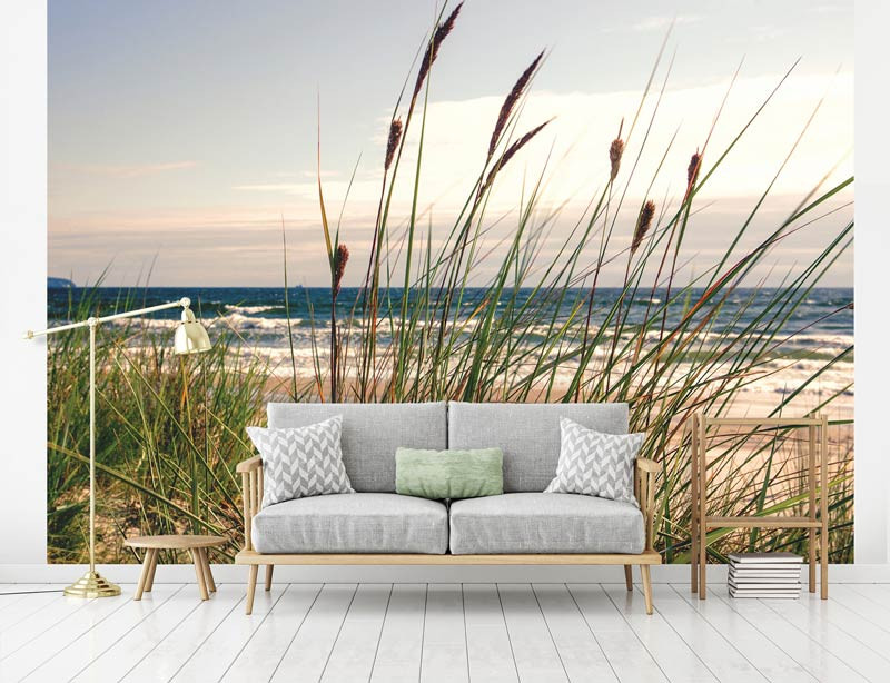 Vliestapete der Blick zwischen den Dünen des Strandes und das klare blaue Meer.