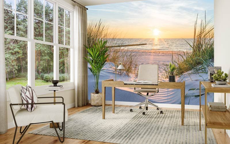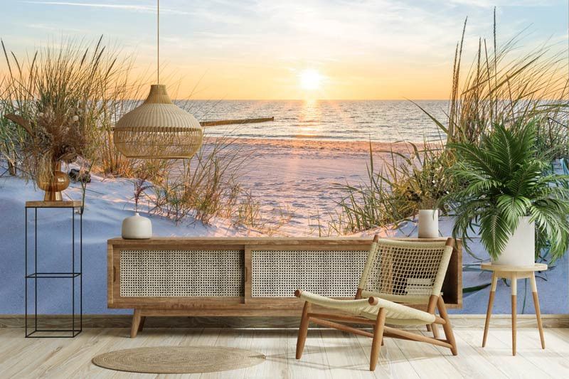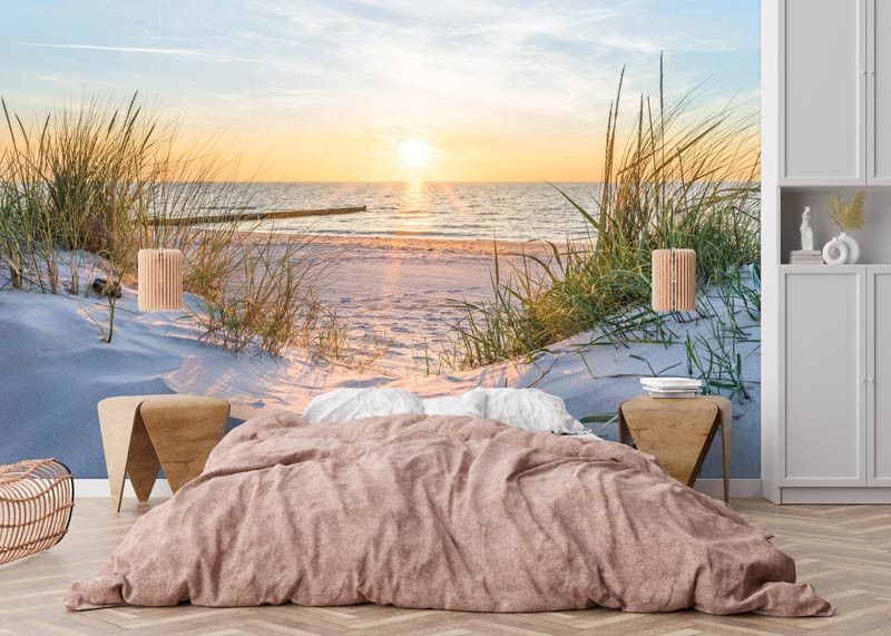 Fototapete, die den herrlichen Blick von den Dünen auf den Strand und den schönen Sonnenaufgang über dem Meer zeigt.