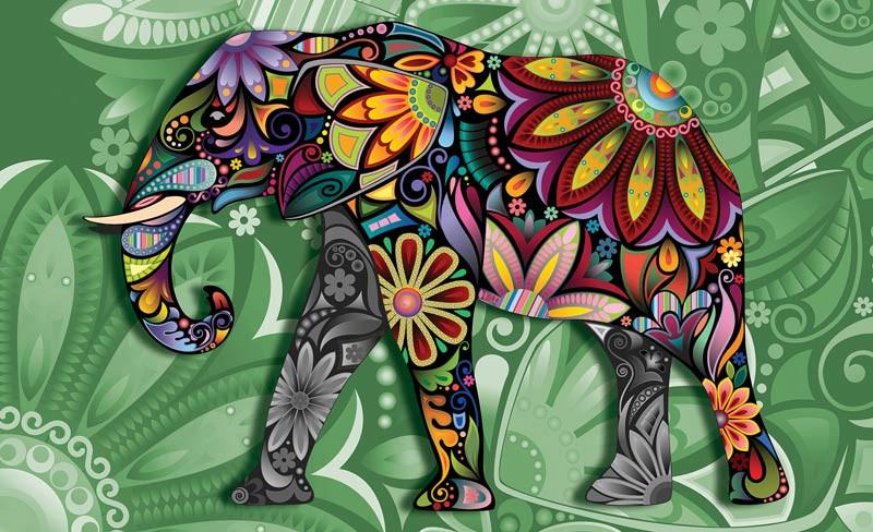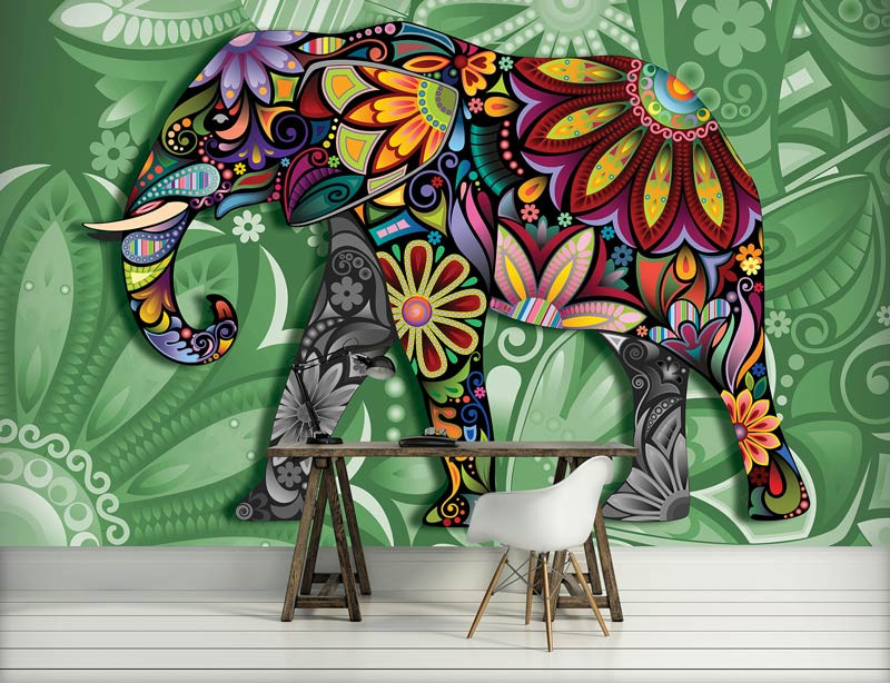 Fototapete von einem schönen Kunstwerk mit einem anmutigen Elefanten und einige Blumen.