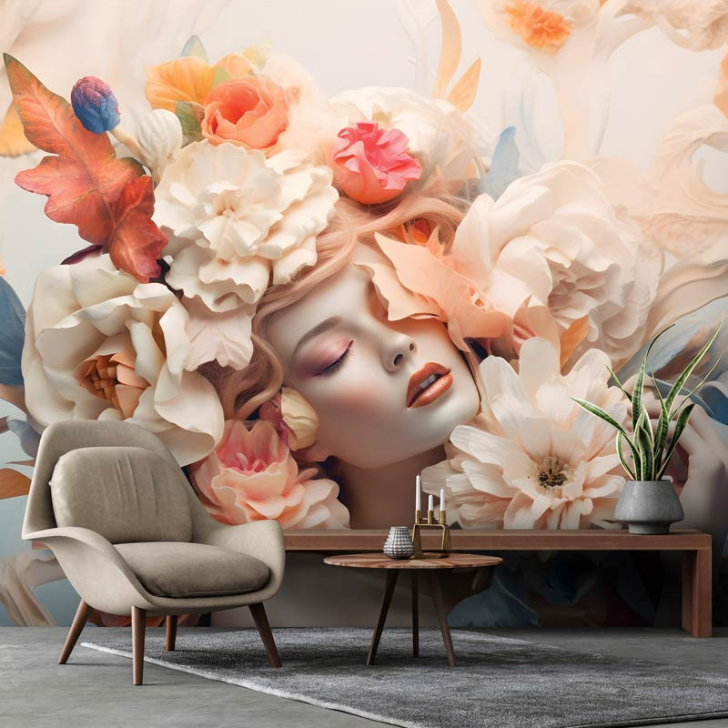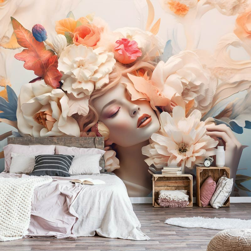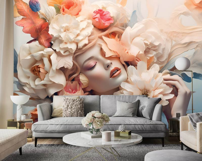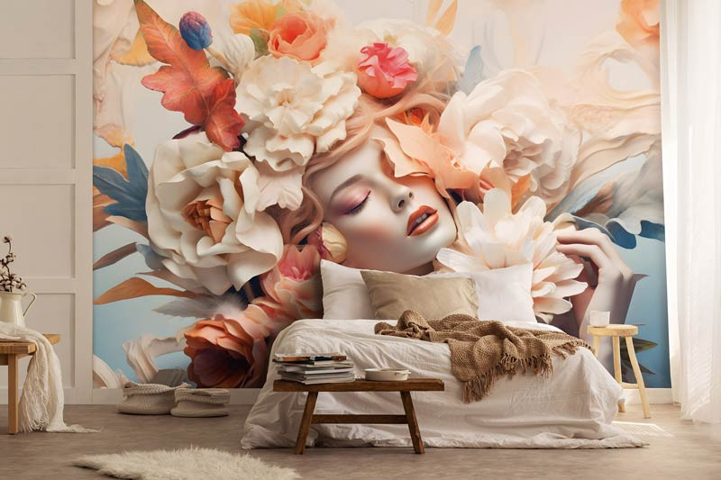 Fototapete Elegante Frau zwischen pastellfarbenen Blumen