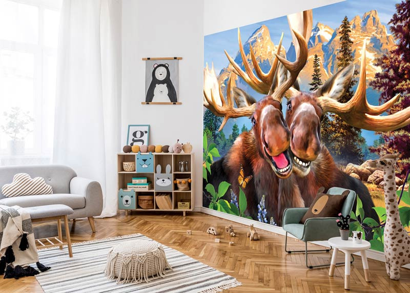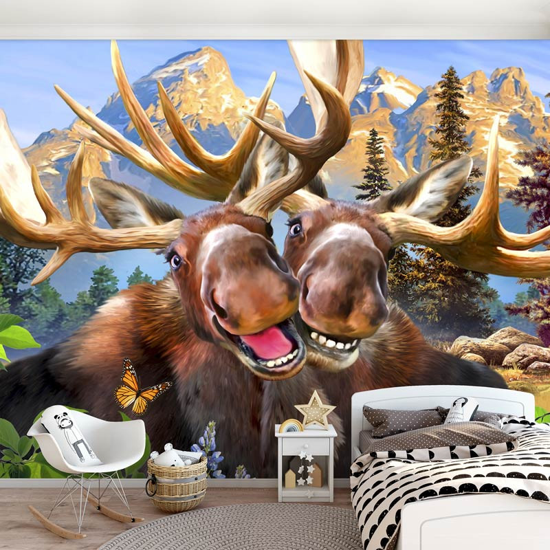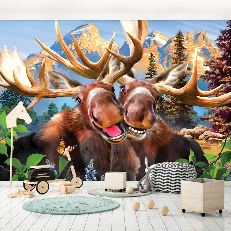 Vlies-Fototapete von 2 lustigen Elchen, die so verrückt wie möglich zusammen abgebildet sind! Ein Must-Have für jedes Kinderzimmer.