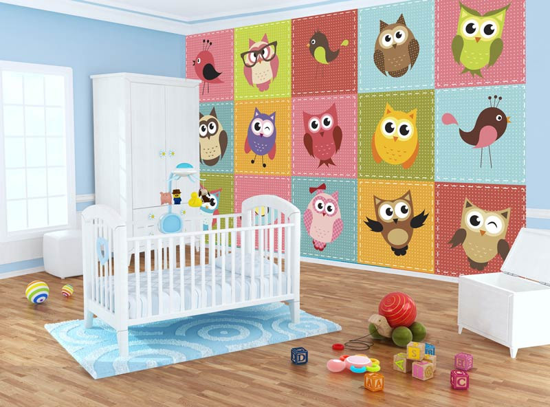 Vlies-Fototapete von verschiedenen Eulen und Vögeln, dargestellt in farbigen Quadraten.