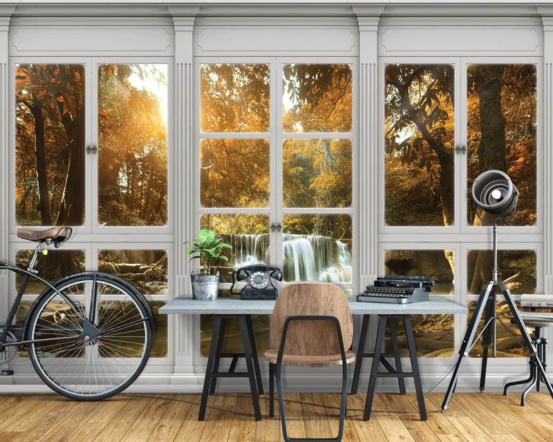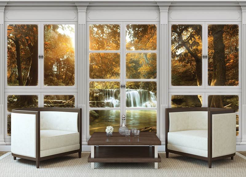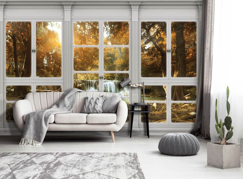 Vliestapete mit dem Blick auf einen Wasserfall in einem schönen, herbstlichen Wald, wie aus dem Fenster gesehen. Dies schafft einen fantastischen 3D-Effekt!
