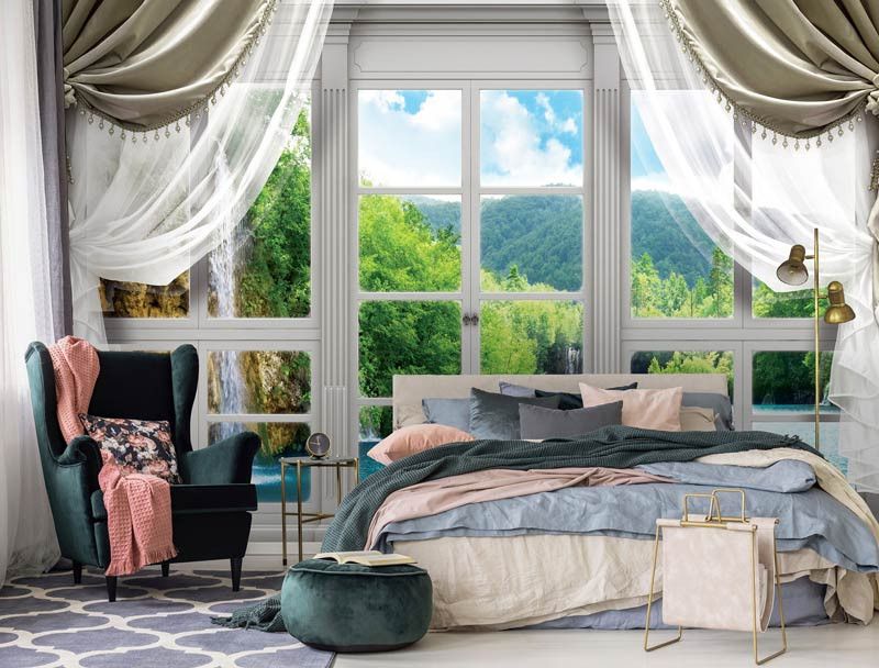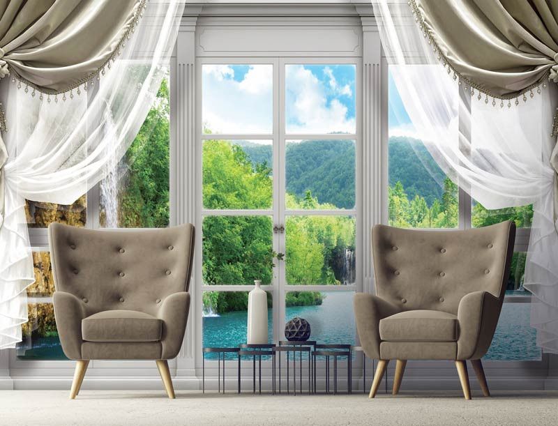 3D Vliestapete mit dem Blick auf einen schönen Wasserfall, umgeben von einer fantastischen Landschaft, aus dem Fenster gesehen.