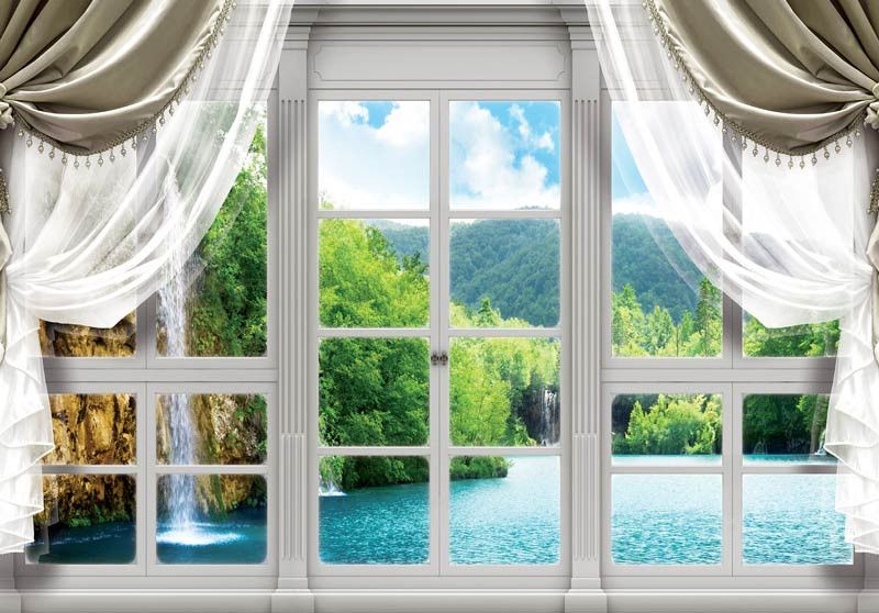 Fototapete Blick aus dem Fenster eines Wasserfalls 3D.