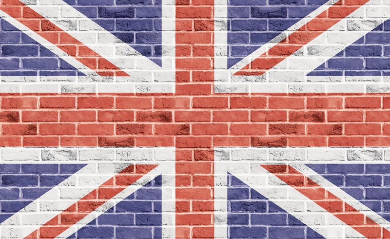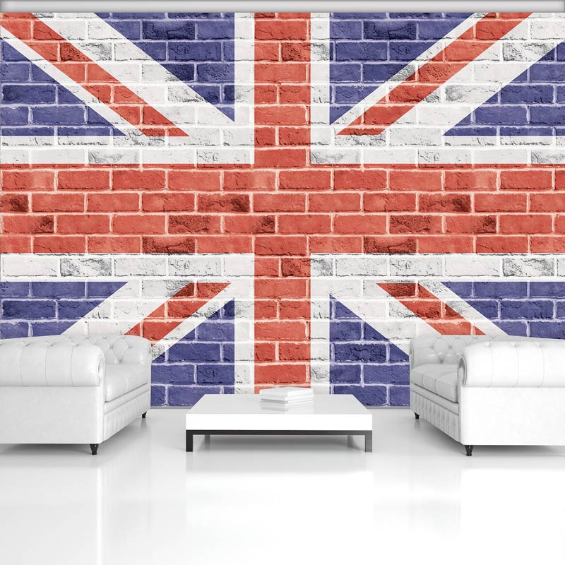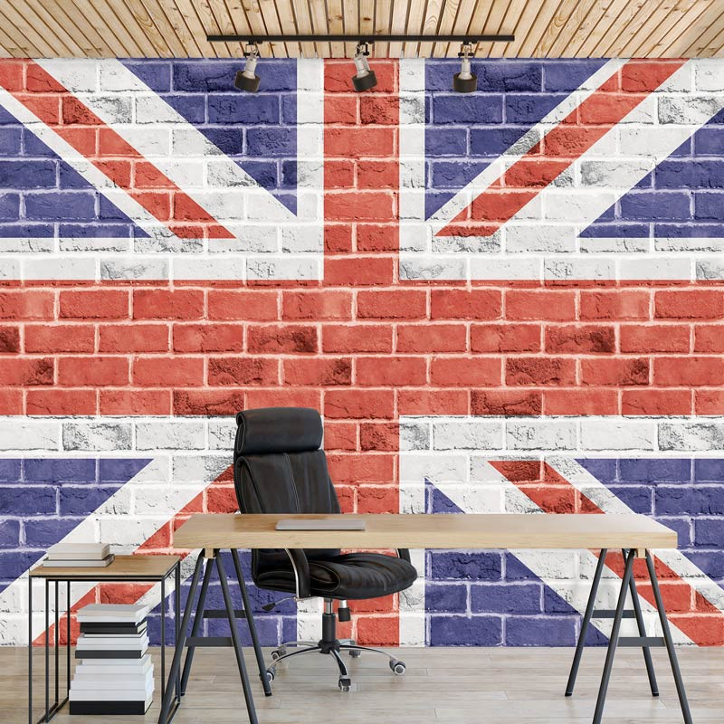 Fototapete mit der Flagge Großbritanniens, gerendert als Wandbild auf einer Ziegelwand.