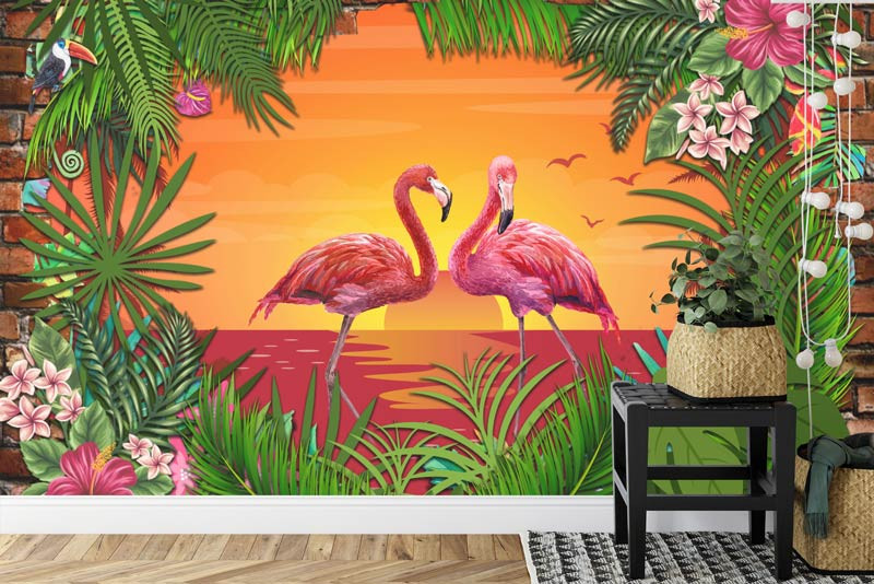 Lassen Sie sich von der anmutigen Pracht der Fototapete Flamingos bei Sonnenuntergang 3D verzaubern. Erleben Sie die heitere Schönheit eines tropischen Sonnenuntergangs, bei dem sich farbenprächtige Flamingos am Wasser versammeln.