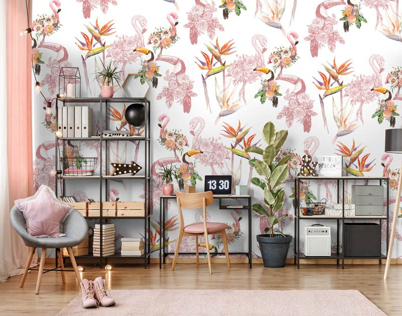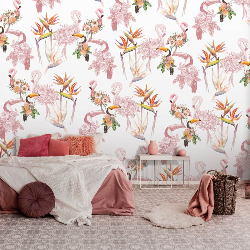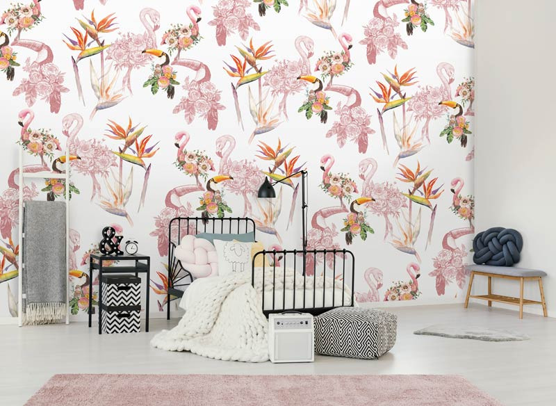 Die Flamingo- und Tukan-Fototapete ist ein echter Blickfang und schafft einen einzigartigen Look im Kinderzimmer, Wohnzimmer, Schlafzimmer oder jedem anderen Raum.