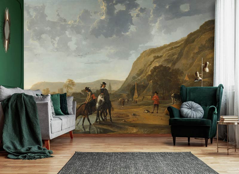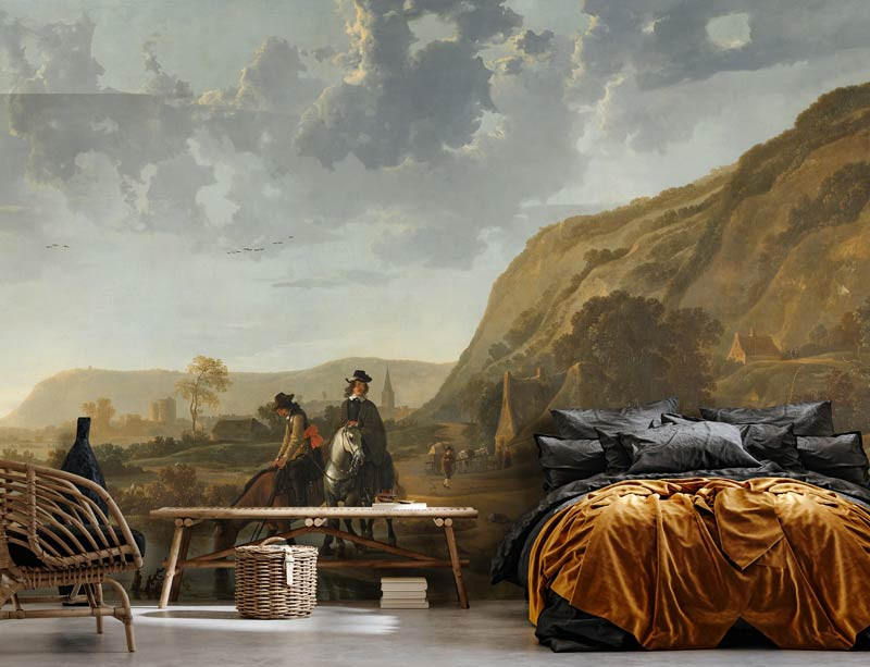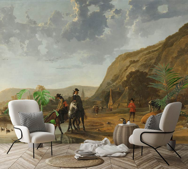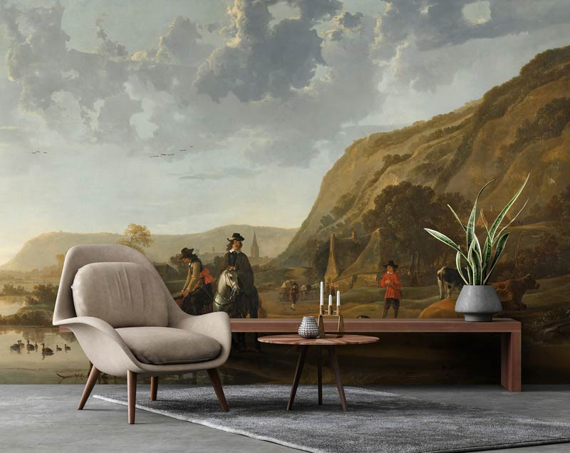 Holen Sie sich mit der Fototapete Flusslandschaft mit Reitern die ruhige Schönheit eines Meisterwerks aus dem 17. Jahrhundert nach Hause. Basierend auf dem Gemälde von Aelbert Cuyp, das zwischen 1653 und 1657 entstand, zeigt dieses Design eine weite Flusslandschaft an der Waal in der Nähe von Nijmegen. Ein klarer blauer Himmel mit luftigen Wolken und sanftem Licht erweckt diese idyllische Szene zum Leben.