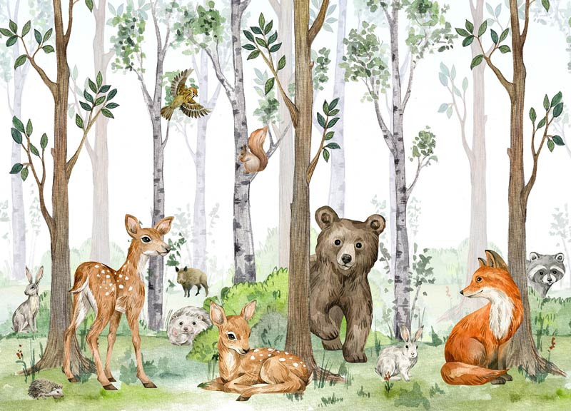 Bringen Sie eine fröhliche und verspielte Atmosphäre in das Zimmer Ihres Kindes mit der Fototapete Cheerful Forest Animals. Dieses bezaubernde Design zeigt einen lebendigen Wald voller fröhlicher Tiere wie Eichhörnchen, Bären und Rehe, die sich zwischen den Bäumen verstecken. Die sanften Farben und verspielten Illustrationen machen die Tapete perfekt für ein gemütliches und fantasievolles Kinderzimmer.