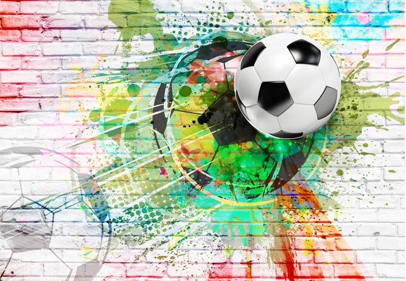 Fußball-Fototapete mit einem brillanten, farbenfrohen Graffiti-Wandbild auf einer Ziegelwand.
