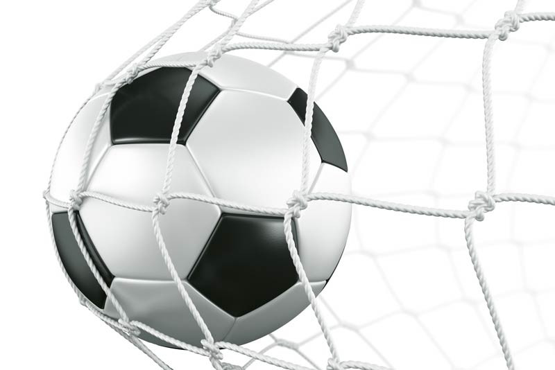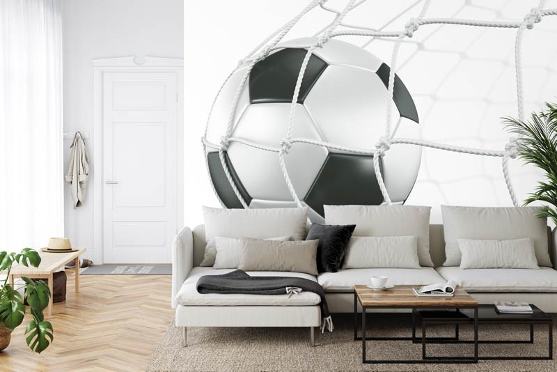 Schaffen Sie eine Atmosphäre des puren Triumphs in Ihrem Raum mit unserer Fototapete Fototapete. Dieses fesselnde Design zeigt den Höhepunkt eines Fußballspiels, mit einem Fußball, der makellos im Netz des Tores sitzt, vor einem strahlend weißen Hintergrund.