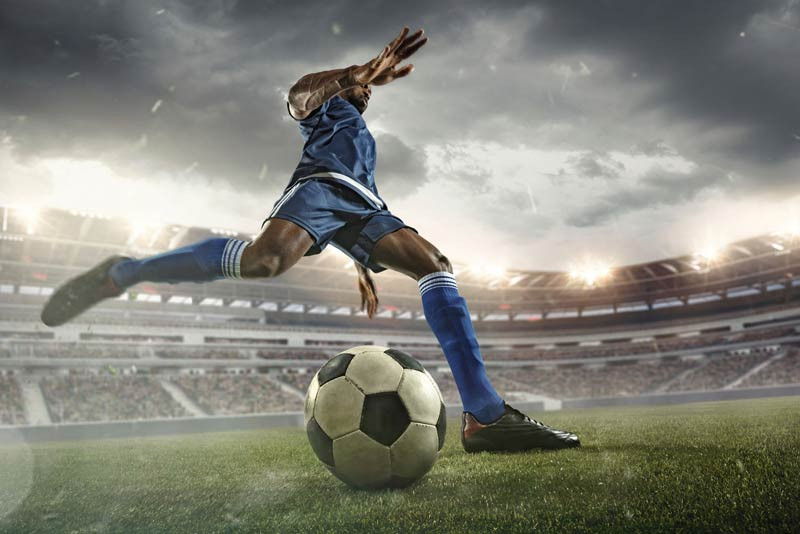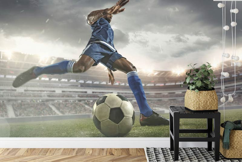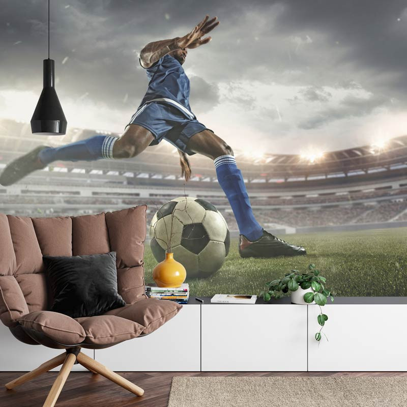 Stellen Sie sich vor, Sie wären mitten im Geschehen, während der Fußballer den Ball in diesem realistischen und inspirierenden Kunstwerk kontrolliert. Ob im Schlafzimmer eines Fußballfans oder in einer Sportbar, diese Fototapete wird den Raum in eine dynamische und aufregende Umgebung verwandeln.