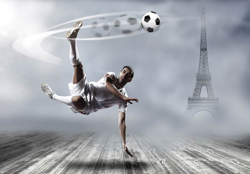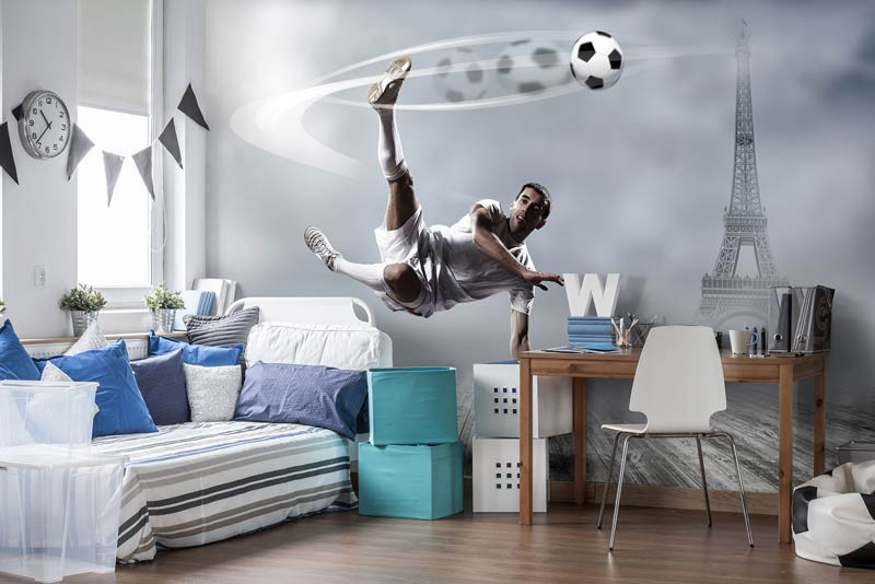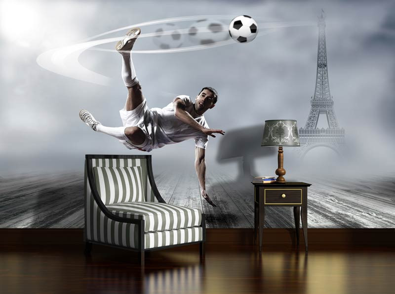 Vliestapete eines Fußballers, der vor dem Eiffelturm mit einem Fallrückzieher den Ball ins Tor schießt.