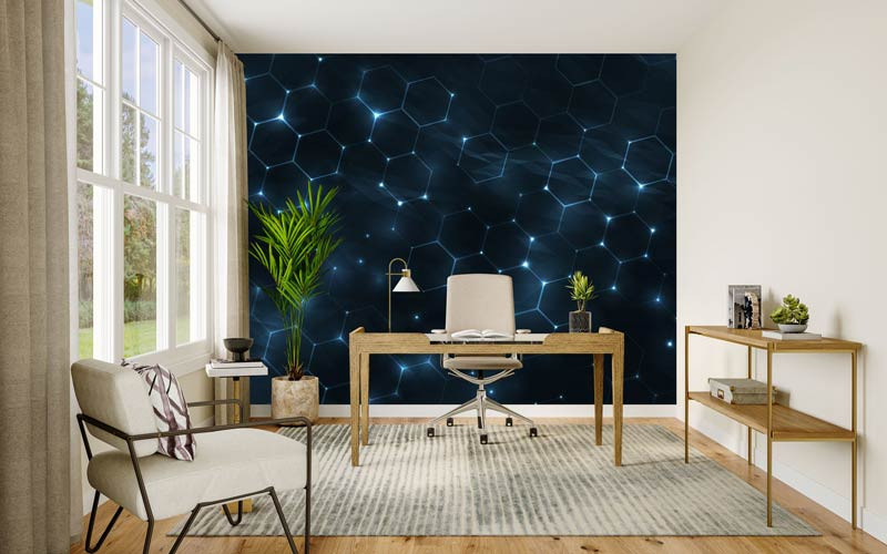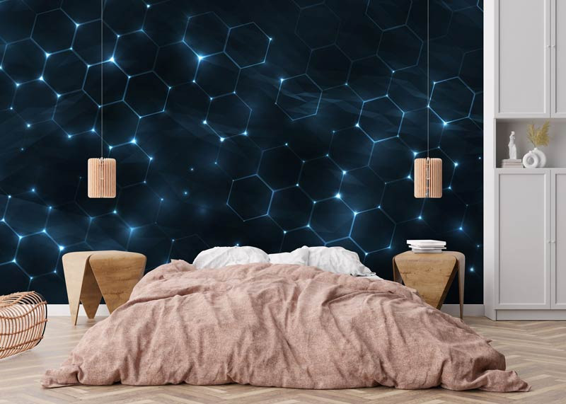Ein klares und modernes Design, bei dem die Sechsecke durch dezente blaue Neon-Akzente beleuchtet werden. Der dunkle Hintergrund sorgt für Tiefe, während die leuchtenden Linien einen dynamischen und hochtechnologischen Effekt erzeugen.