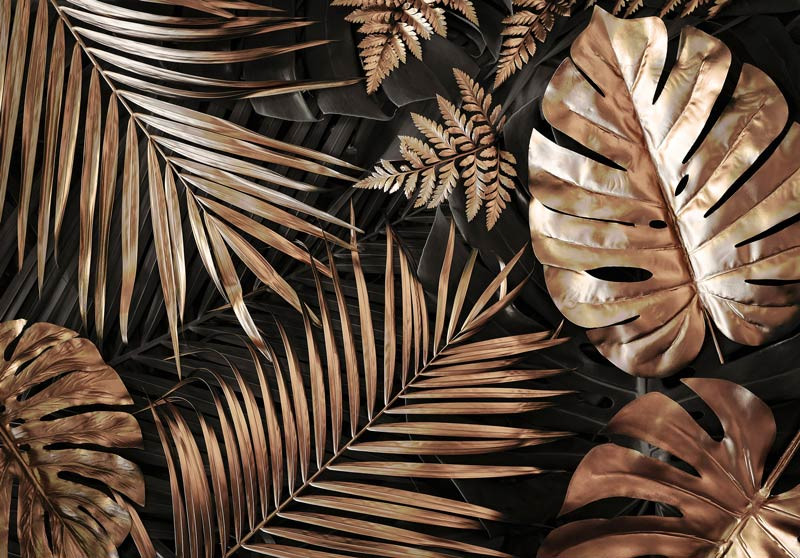 Fototapete mit botanischen, goldenen Blättern.