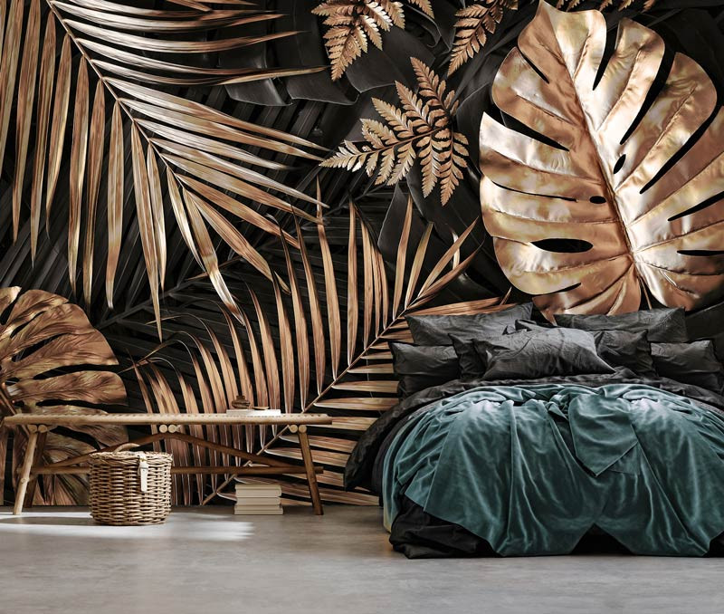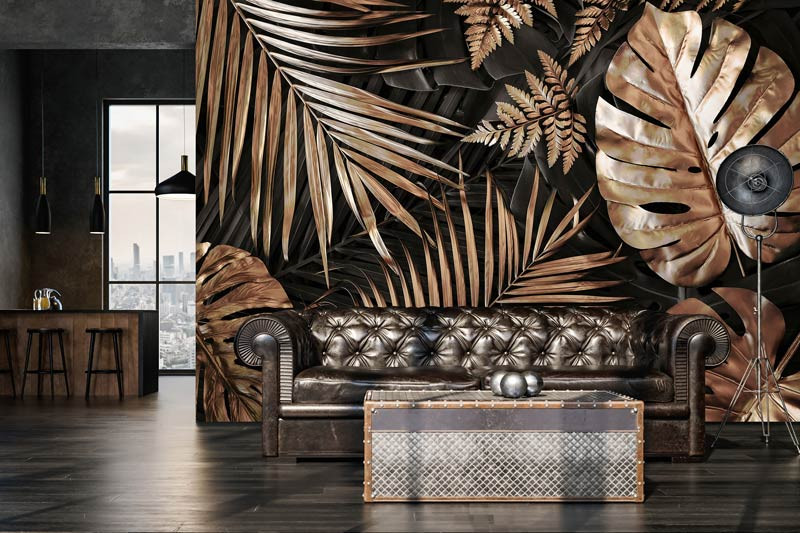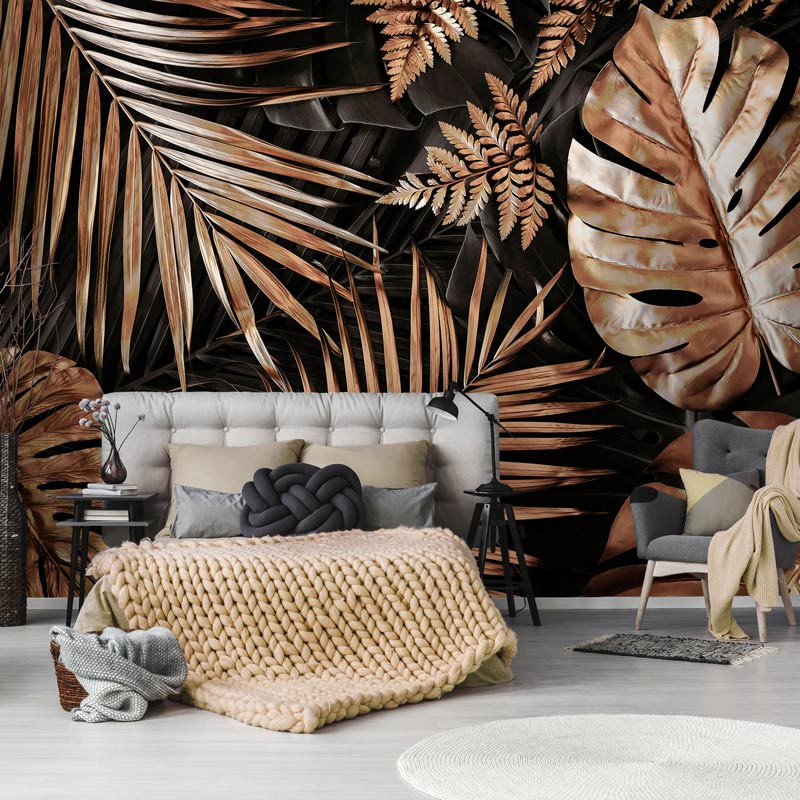 Die Fototapete mit den goldenen Blättern ist ein echter Blickfang und verleiht jedem Raum einen luxuriösen Look.