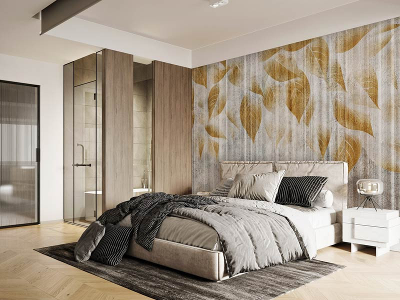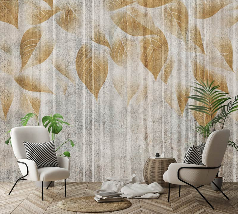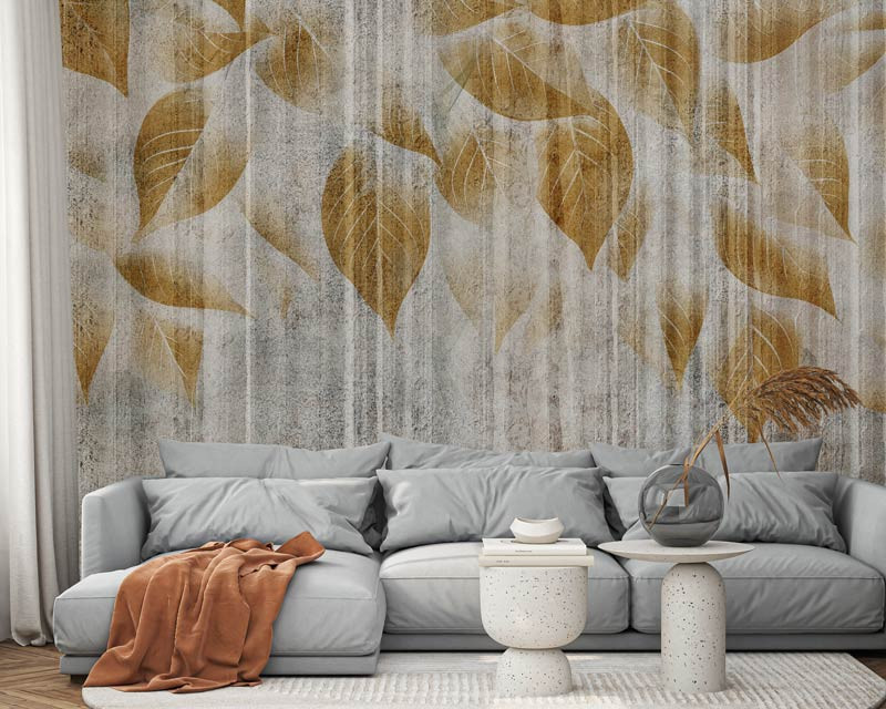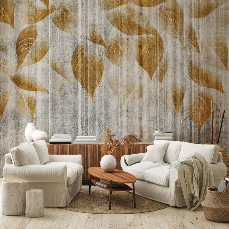 Verleihen Sie Ihrem Interieur einen luxuriösen Look mit der Fototapete Golden Leaves on Rough Concrete. Die goldenen Blätter auf der rauen Betonstruktur schaffen eine einzigartige Kombination aus Eleganz und industriellem Stil. Perfekt für moderne Wohnräume, die einen Hauch von Glamour gebrauchen können.