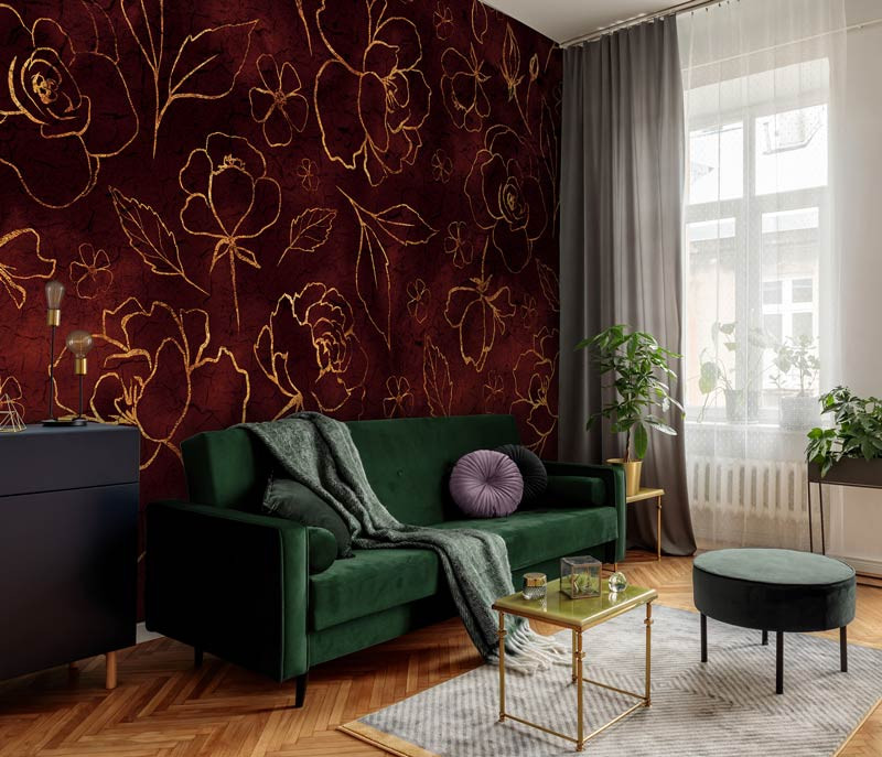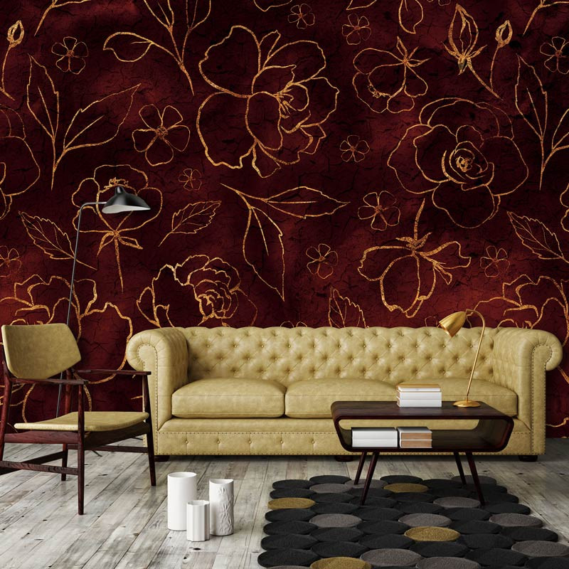 Goldblumen und Blätter Fototapete ist die perfekte Ergänzung für jeden Raum.