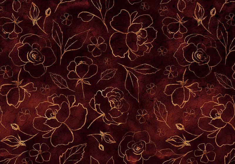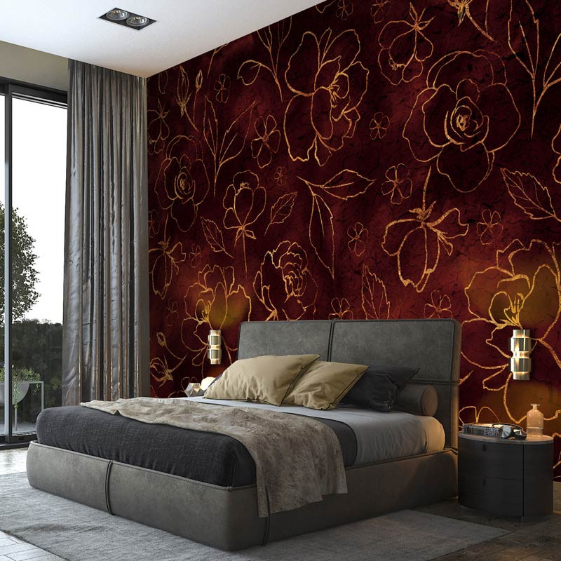 Fototapete mit schönen, goldenen Blumen und Blättern.