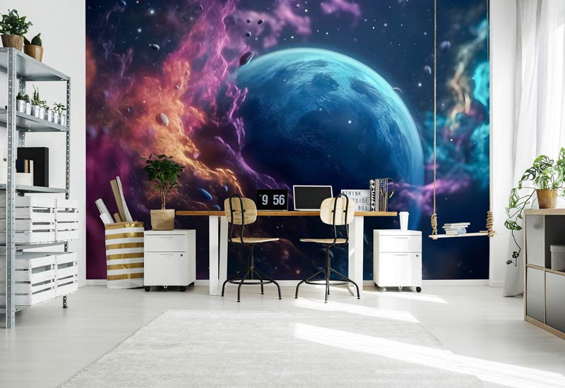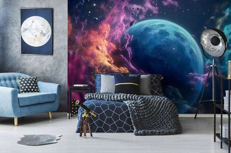 Verleihen Sie dem Kinderzimmer einen kosmischen Anstrich und inspirieren Sie ihre Träume mit dieser wunderschönen Fototapete. Lassen Sie sie sich von den Wundern des Universums umgeben, während sie sich auf spannende Weltraumabenteuer vorbereiten.