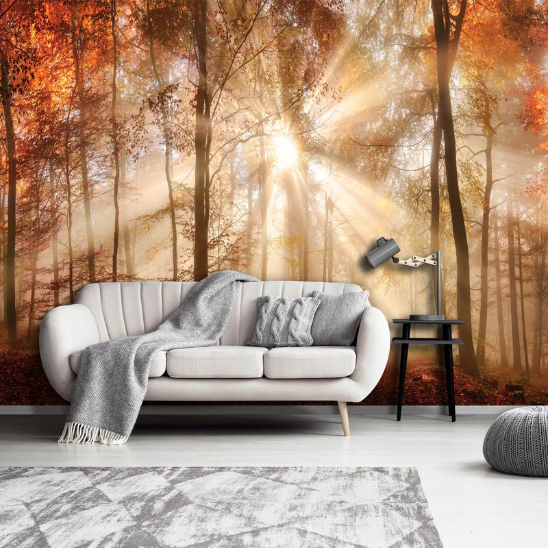 Vliestapete, die einen herbstlichen Wald mit, zwischen den Bäumen, schönen, leuchtenden Sonnenstrahlen darstellt.