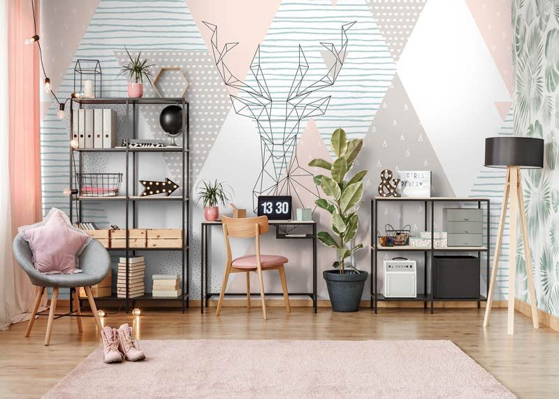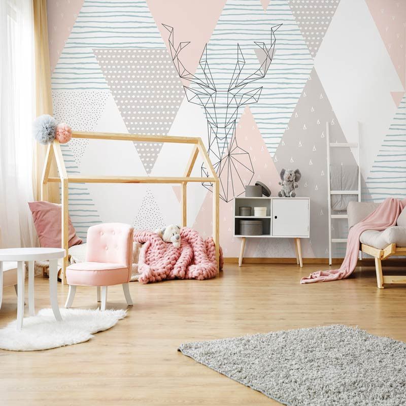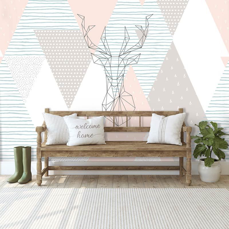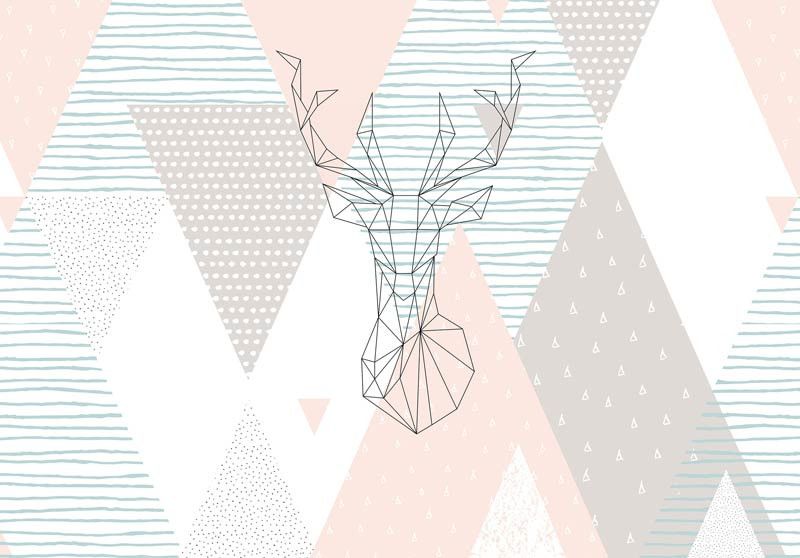 Fototapete von einem schönen, geometrischen, abstrakten Kunstwerk. Dazu gehört eine Zeichnung eines Hirsches.
