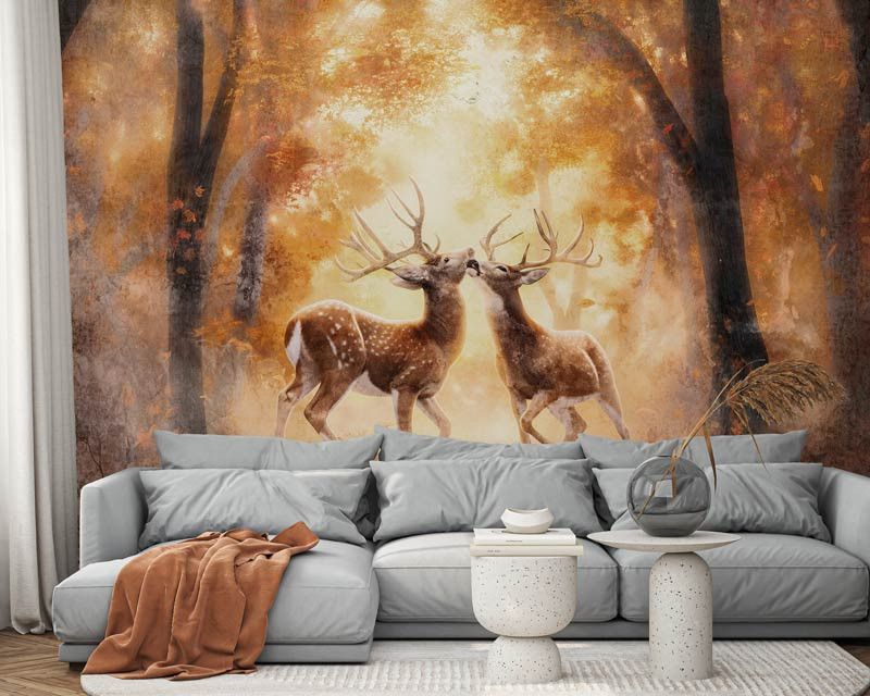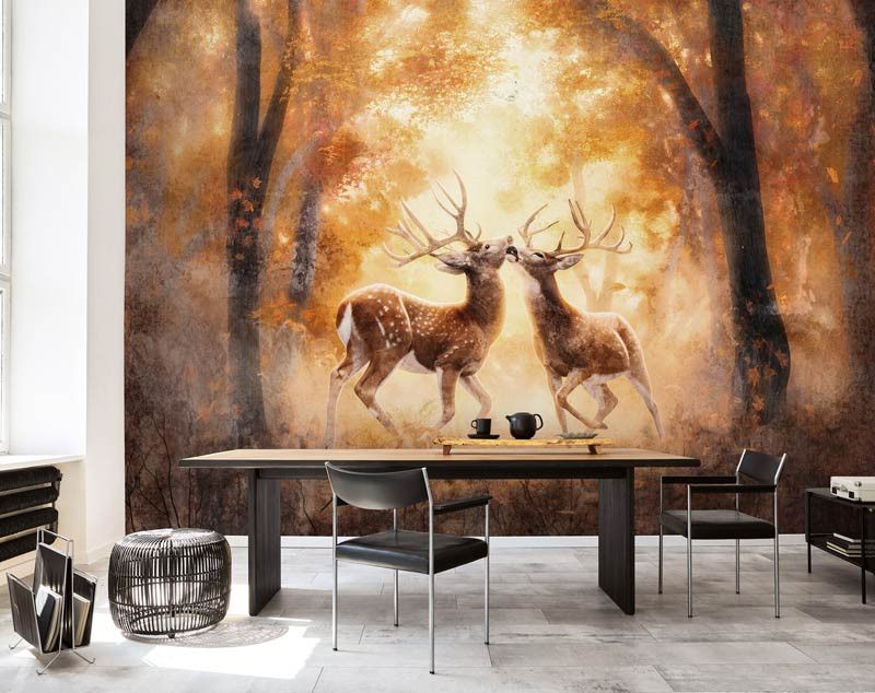 Bringen Sie die atemberaubende Schönheit der Natur in Ihr Interieur mit unserer Fototapete Deer in the Woods. Dieses wunderschöne Design zeigt zwei Rehe, die sich liebevoll gegenüberstehen, umgeben von der Ruhe und Stille einer Waldlandschaft. Das sanfte Licht, das durch die Bäume fällt, schafft eine warme und einladende Atmosphäre, die sich perfekt für das Wohnzimmer, Schlafzimmer oder Kinderzimmer eignet.