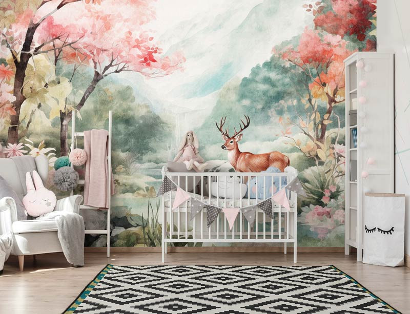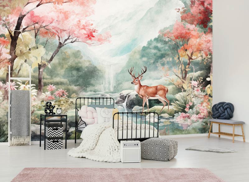 Lassen Sie die Fantasie Ihres Kindes mit unserer bezaubernden Fototapete Deer in the Wilderness zum Leben erwachen. Dieses lebendige Design zeigt einen majestätischen Hirsch, der durch einen üppigen Wald spaziert, umgeben von bunter Flora und Fauna. Schaffen Sie eine magische Atmosphäre im Kinderzimmer und lassen Sie Ihr Kind an abenteuerliche Orte träumen.