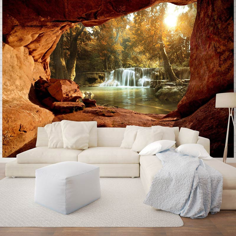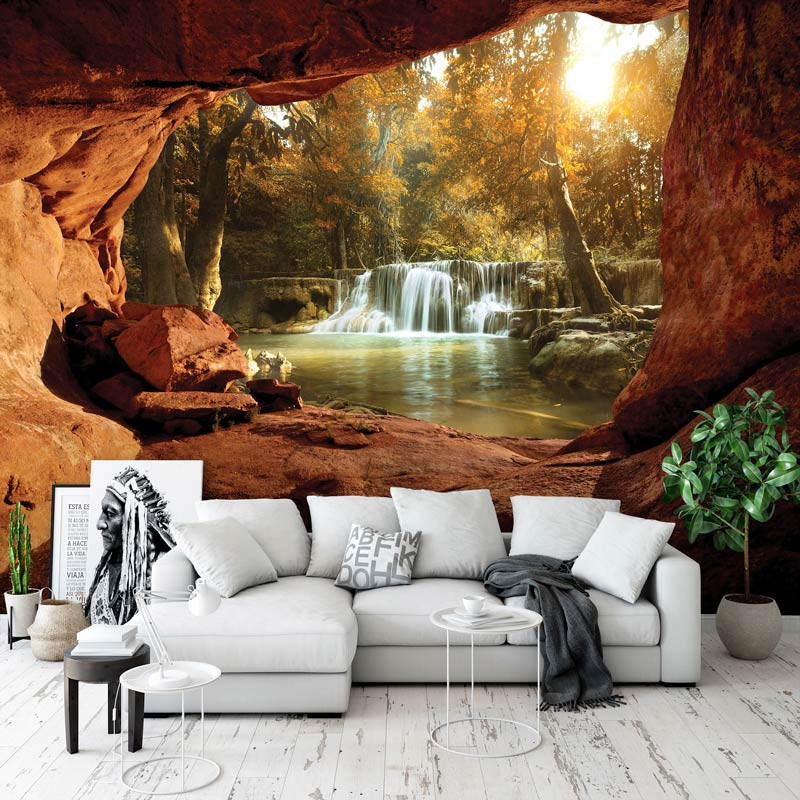 Vlies-Fototapete mit dem Blick auf einen Wasserfall im Wald, gesehen von einer Höhle. Der Blick aus der Höhle schafft einen tollen, 3D-Effekt.