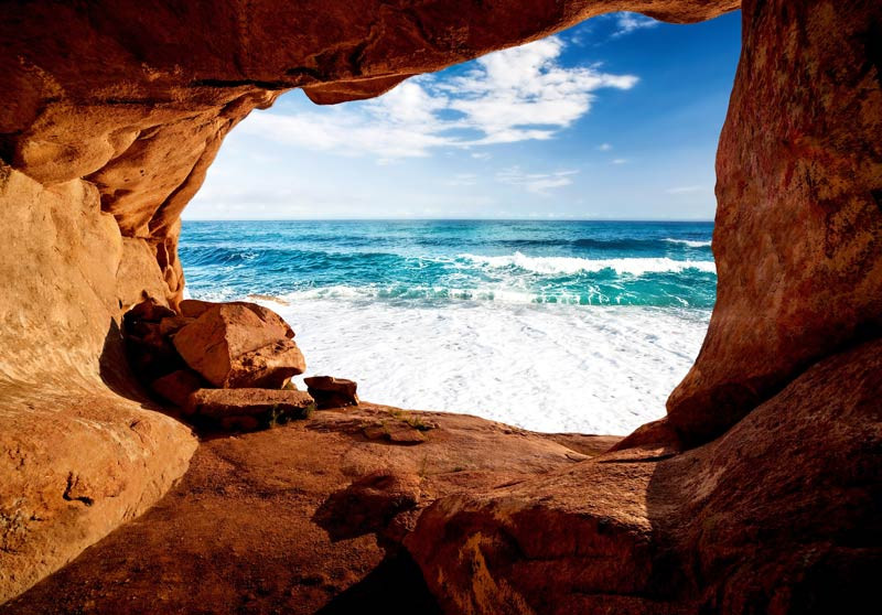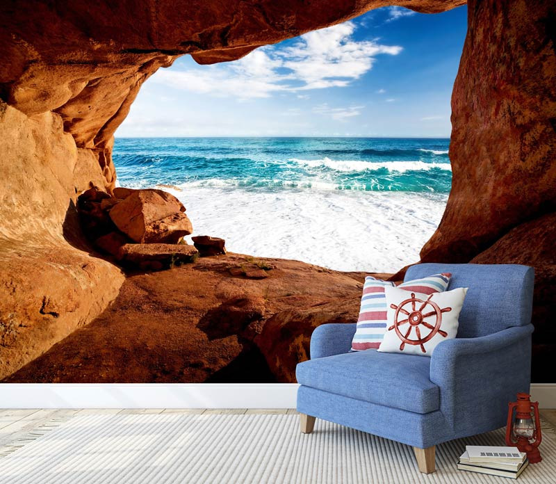 Vlies-Fototapete des Blicks auf das Meer aus einer Höhle gesehen. Der Blick aus der Höhle schafft einen tollen, 3D-Effekt.