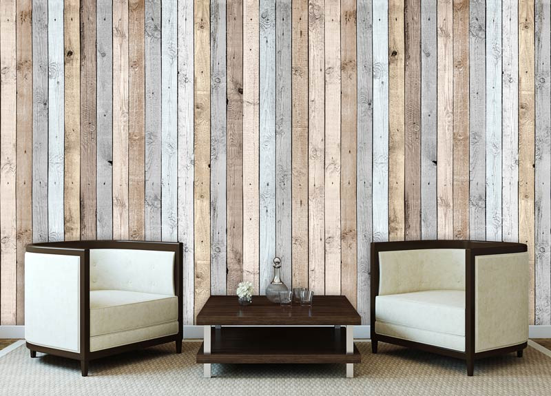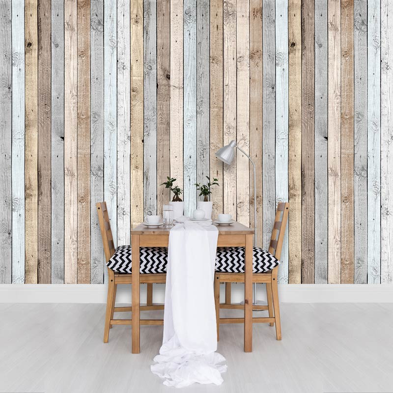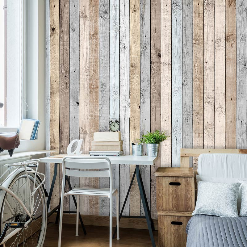 Vlies-Fototapete mit einer farbigen Wand aus Holzbrettern.