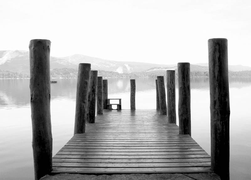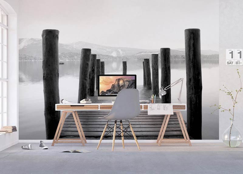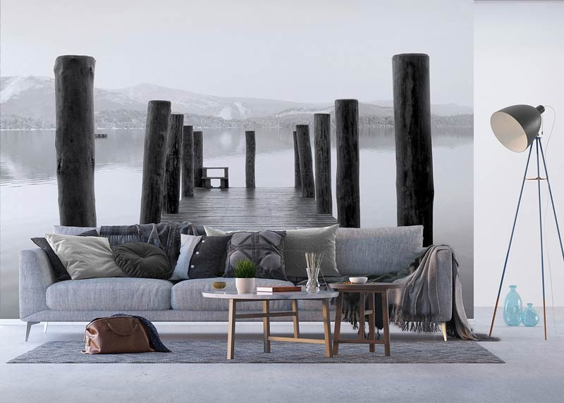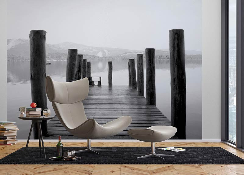 Bringen Sie mit dieser Fototapete die Gelassenheit eines Holzstegs am Wasser in Ihr Zuhause. Die warmen Holztöne und die sanften Blautöne des Wassers schaffen eine heitere und ruhige Atmosphäre, die sich ideal für Wohn- und Schlafräume eignet.