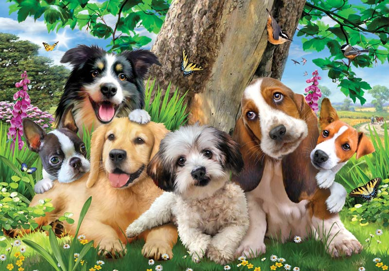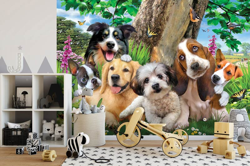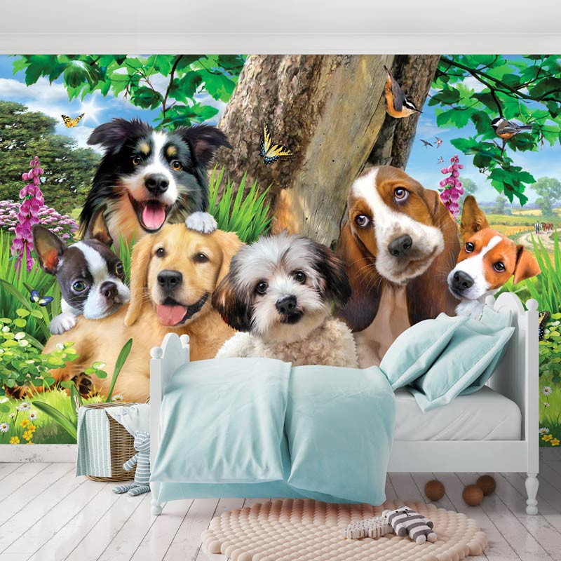 Vlies-Fototapete mit schönen, posierenden Hunden und einigen wunderschönen Schmetterlingen. Bringt jeden Raum zum Strahlen!