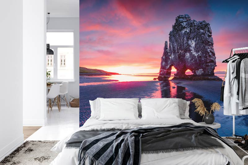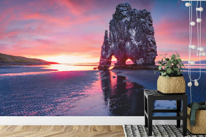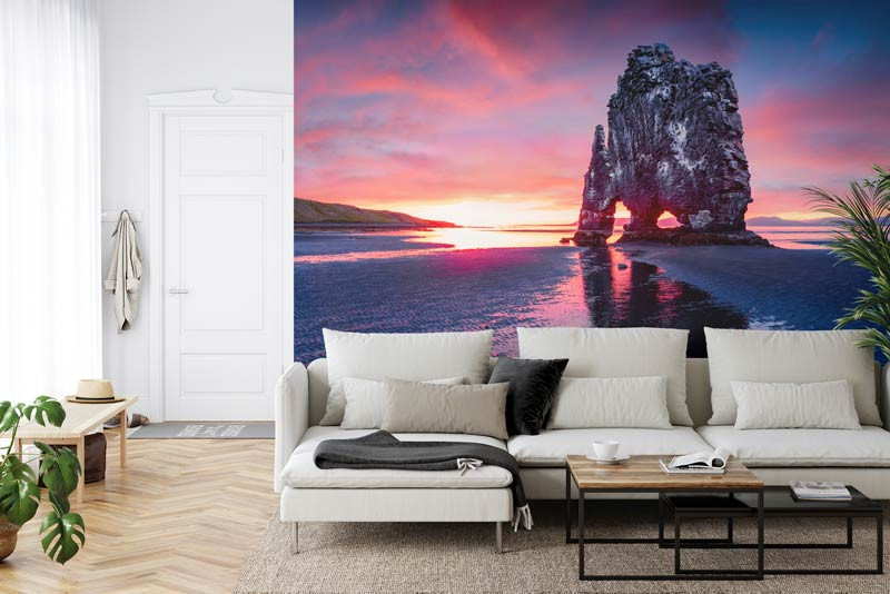 Lassen Sie sich vom magischen Sonnenuntergang in Hvitserkur mit der Fototapete Hvitserkur Sonnenuntergang, Island verzaubern. Erleben Sie die dramatischen Farben und die beruhigende Gelassenheit dieses Naturwunders.
