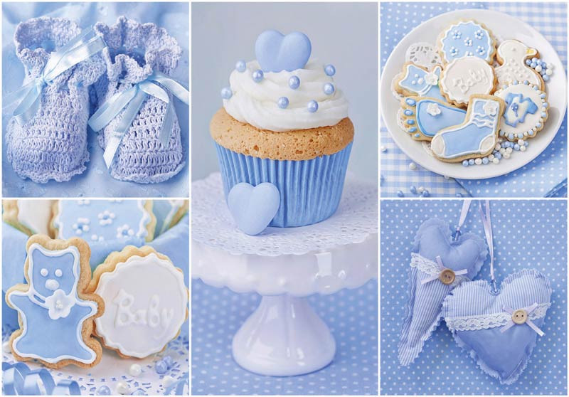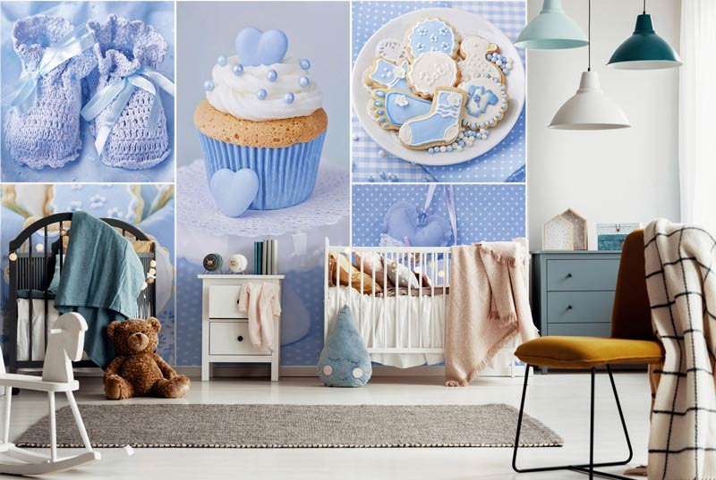 Vlies-Fototapete einer Collage in Blau, mit allem, was mit der Ankündigung Ihres Babys zu tun hat.
