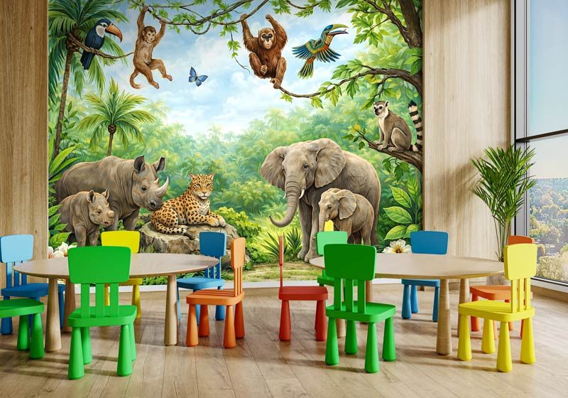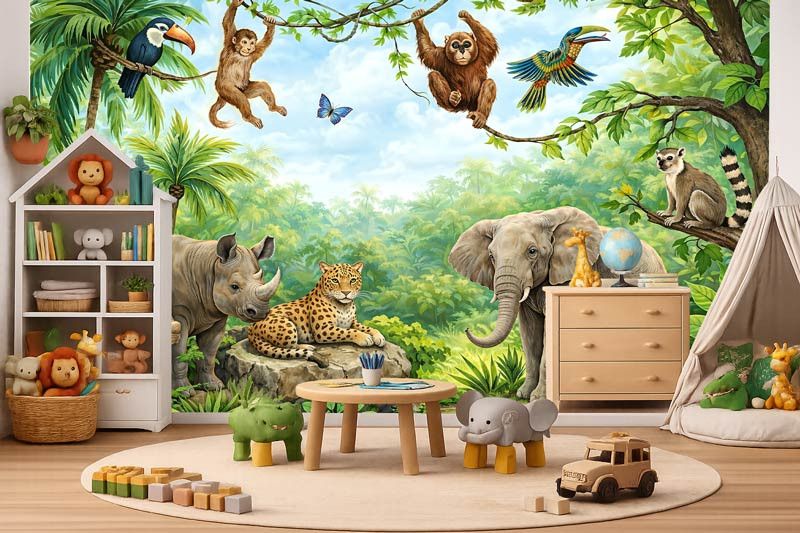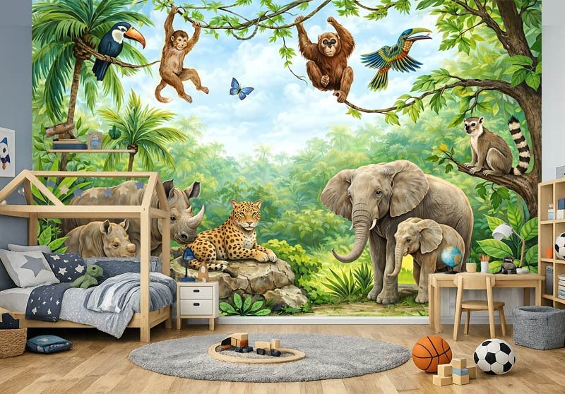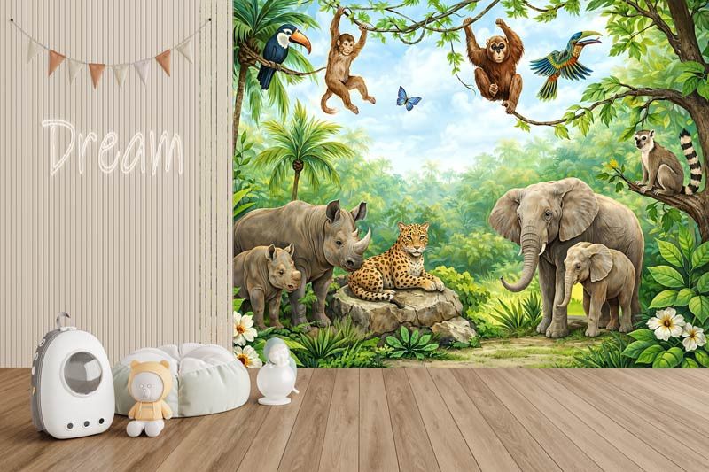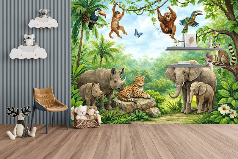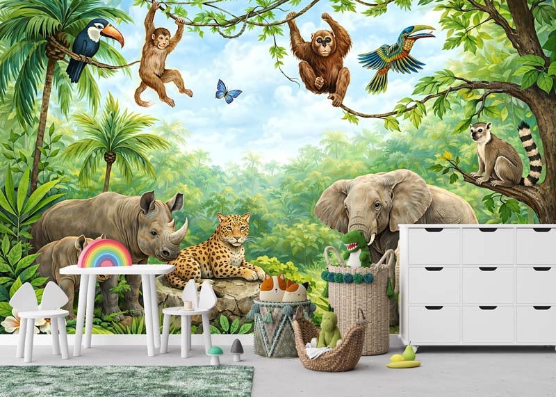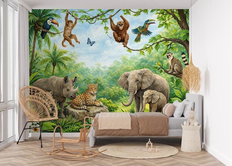 Die verspielte Komposition und die harmonischen Farben machen dieses Design perfekt für ein Kinderzimmer, in dem Fantasie und Abenteuer im Mittelpunkt stehen. Die Kombination aus freundlichen Tieren und einer grünen Dschungelkulisse sorgt für eine warme und lebendige Atmosphäre.