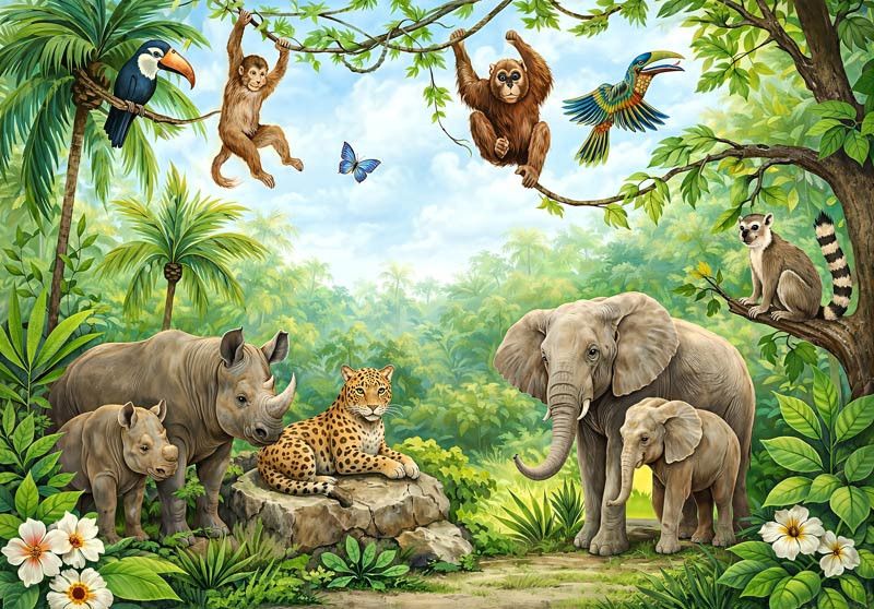 Hole dir die Magie des Dschungels nach Hause mit dieser farbenfrohen Fototapete voller beeindruckender Tiere. In diesem lebendigen Motiv siehst du unter anderem Elefanten, Affen, einen Leoparden und exotische Vögel zwischen üppigen Pflanzen und tropischen Bäumen.