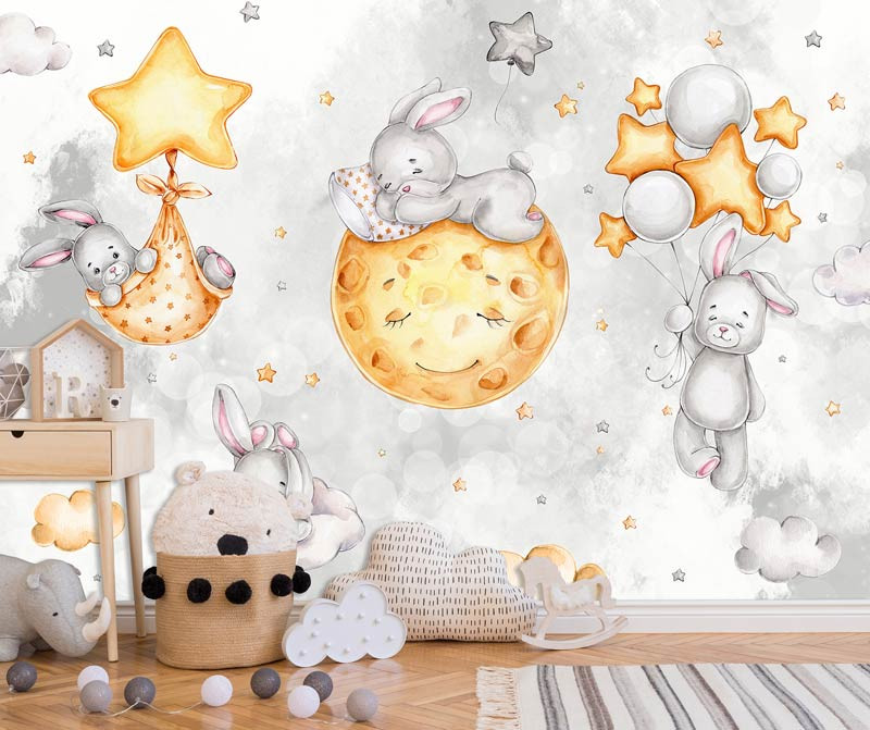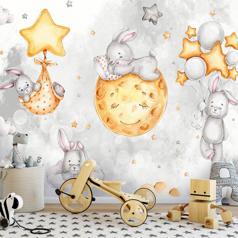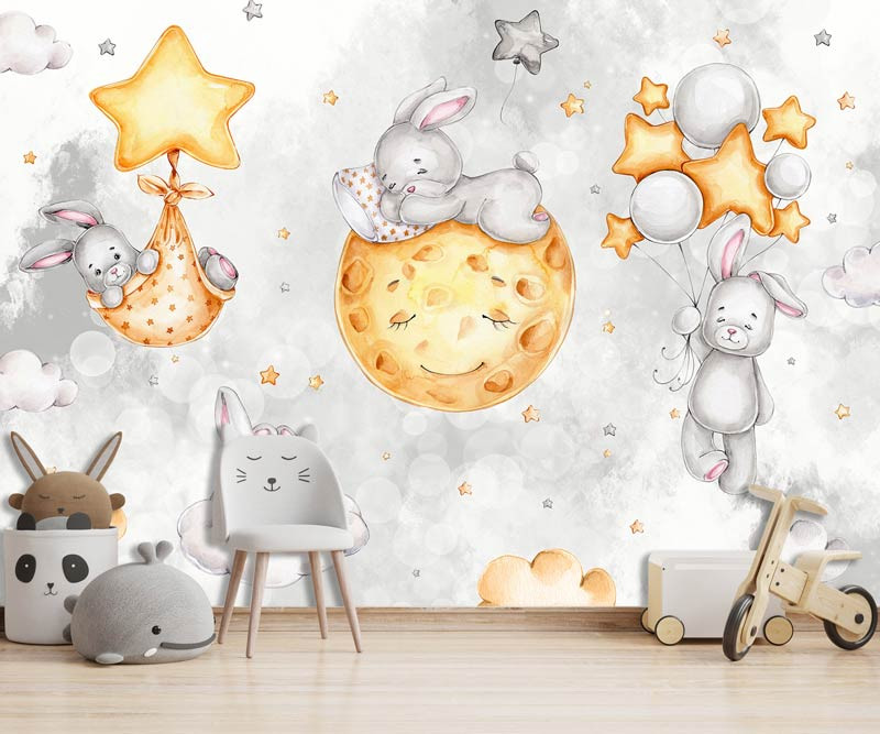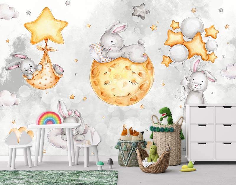 Schaffen Sie eine verträumte Atmosphäre im Kinderzimmer mit unserer Fototapete Kaninchen in den Wolken. Lassen Sie sich von dem bezaubernden Bild der in den Wolken spielenden Häschen verzaubern und bringen Sie einen Hauch von Fantasie in jeden Raum. Diese Fototapete ist perfekt geeignet, um ein spielerisches und charmantes Element in das Kinderzimmer zu bringen und regt die Fantasie Ihrer Kleinen an.