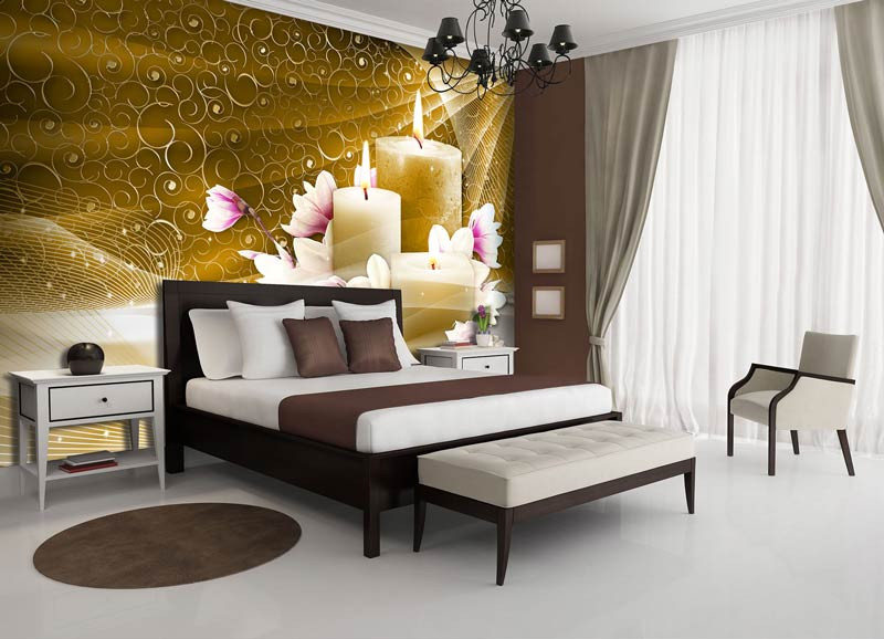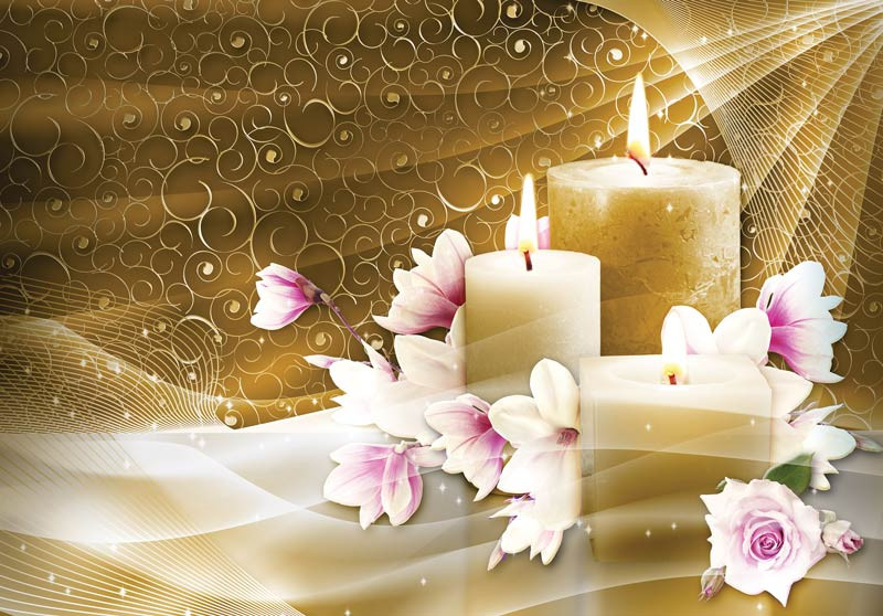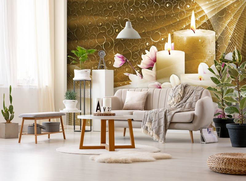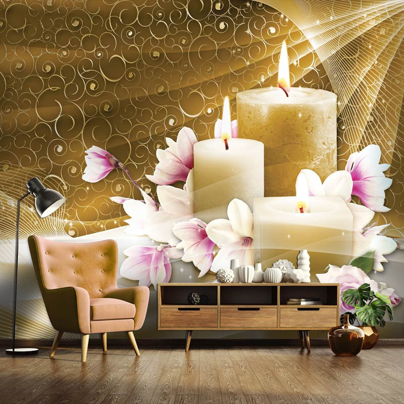 Vliestapete von Kerzen und Blumen, angezeigt auf einem dekorativen goldenen Hintergrund.