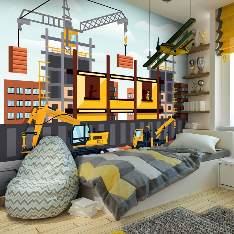 Fototapete für Kinderzimmer mit Hebekränen und anderen gelben Maschinen. Fototapete von diesen Kränen wird das Zimmer Ihres Kindes zu verwandeln.